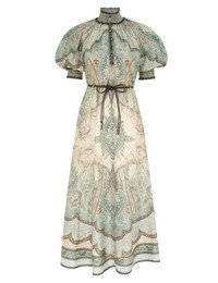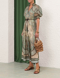 ITEM DETAILS The Wanderlust Billow Dress in Tapestry Teal Multi from our Resort Swim 2026 Collection. A silk maxi dress featuring a shirred stand collar, short billowed sleeves, finished with functional side pockets and frill trim. - Silk habutae fabric - Shirred neck and cuffs - Short billow sleeves - Rouleau buttons down the centre front - Removable rope waist belt with beads - Placement printed - Comes with a separate slip Style Code: 5581DRS262 SIZE DETAILS 0P 0 1 2 3 4 Length 49 54 54.5 54.5 54.5 55 Bust 50.5 52 54.5 56.5 58.5 60.5 Sleeve 16.5 17.5 17.5 18 18.5 18.5 Slightly fitted at the bust and waist, loose at the hip Light-weight, non-stretchy fabric This garment fits true to size Available in size 0P, suited to clients who are under 5'3"/ 160cm Model is 5'9.5"/178 cm, bust size 32C/10C and wears a size 0 Item measurements are in inches CARE INSTRUCTIONS Main: 100% silk; pocketing: 100% silk; slip: 86% recycled polyester, 14% elastane Dry clean only code f (hydrocarbon only); Remove any detachable trims prior to dry cleaning; Cover to protect trim; Iron in low temperature with protective cloth; Light steam only; Do not spot clean Gentle cold hand wash separately with mild detergent; Do not bleach; Dry in shade; Iron in low temperature with protective cloth; Do not tumble dry; Dry cleanable code f (hydrocarbon only); Always check the label or care card for specific care instructions.