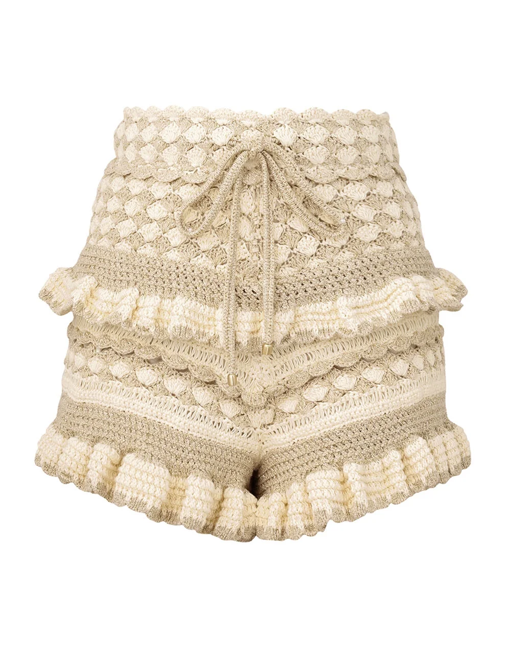 ITEM DETAILS The Wanderlust Crochet Short in Metallic Gold/Cream from our Resort Swim 2026 Collection. A crochet knit short featuring a mid-rise waist, rouleau tie, finished with scalloped trim and frill panel detailing. - Drawstring waist cord with toggle ends - Scalloped trim - Flared hem - Lined Style Code: 6836ARS262 SIZE DETAILS 0P 0 1 2 3 4 Length 9.5 10 10.5 11 11 11.5 Waist 24.5 26 28.5 30 32.5 34 Hip 33 34.5 37 39.5 41 43.5 Inseam 3 3 3 3 3 3 Designed with an elasticated waistband for a flexible fit Crocheted, stretchy fabric This garment fits true to size Available in size 0P, suited to clients who are under 5'3"/ 160cm Model is 5'9.5"/178 cm, bust size 32C/10C and wears a size 0 Item measurements are in inches CARE INSTRUCTIONS Main: 48% viscose, 43% cotton, 9% metallized fibre; lining: 86% recycled polyester, 14% elastane Dry clean only code f (hydrocarbon only); Remove any detachable trims prior to dry cleaning; Cover to protect trim; Iron in low temperature with protective cloth; Do not spot clean; Store garment flat do not hang Always check the label or care card for specific care instructions.