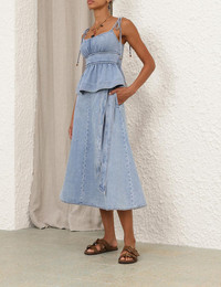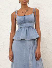 ITEM DETAILS The Wanderlust Denim Cami in Skylark from our Resort Swim 2026 Collection. A denim cami featuring a square neckline, self-tie straps, finished with a centre back zip closure and peplum flare waist detailing. - Denim top - Bow tie straps with beaded trim - Ruched bust - Fixed waistband with peplum - Shirred back bodice - Gold metal centre back zip closure - Heavily gathered Style Code: 5467TRS262 SIZE DETAILS 0P 0 1 2 3 4 Length 6 6.5 6.5 6.5 6.5 6.5 Bust 29 30.5 33 35.5 37 39.5 Waist 24.5 25 27.5 29 31.5 33 Designed to be fitted at the bust and waist This garment fits true to size Available in size 0P, suited to clients who are under 5'3"/ 160cm Model is 5'9.5"/178 cm, bust size 32C/10C and wears a size 0 Item measurements are in inches CARE INSTRUCTIONS Main: 100% cotton; bodice lining: 100% cotton Gentle cold hand wash separately with mild detergent Remove any detachable trims prior to washing Do not soak, rub or wring Do not bleach Do not tumble dry Dry in shade; Iron in low temperature with protective cloth Do not spot clean; Do not dry clean Always check the label or care card for specific care instructions.
