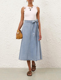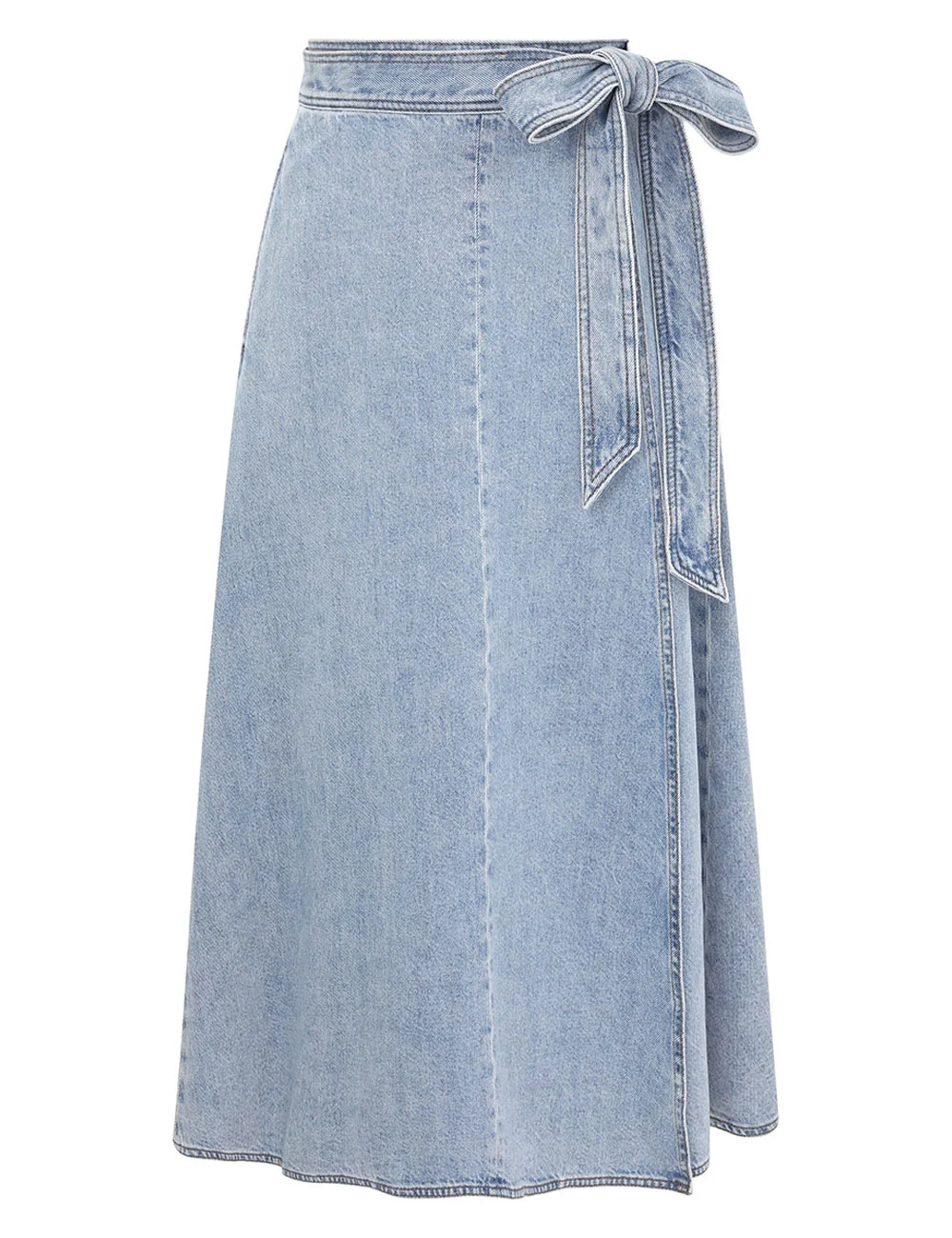 ITEM DETAILS The Wanderlust Denim Wrap Skirt in Skylark from our Resort Swim 2026 Collection. A denim skirt featuring a fitted waistband with bow-tie belt and flared hem. - Midi-length denim skirt - Fixed belt tied at left hand side - Functional side pockets Style Code: 5639SRS262 SIZE DETAILS 0P 0 1 2 3 4 Length 30.5 33.5 33.5 33.5 33.5 33.5 Waist 24.5 26 28.5 30 32.5 34 Fitted at the waist, relaxed throughout This garment fits true to size Available in size 0P, suited to clients who are under 5'3"/ 160cm Model is 5'9.5"/178 cm, bust size 32C/10C and wears a size 0 Item measurements are in inches CARE INSTRUCTIONS Main: 100% cotton; pocketing: 86% polyester, 14% cotton Gentle cold machine wash separately with mild detergent; Remove any detachable trims prior to cleaning Cover to protect trim; Do not soak or bleach; Do not tumble dry; Dry in shade without delay; Iron in low temperature with protective cloth; Do not spot clean; Dry cleanable code p Always check the label or care card for specific care instructions.