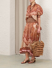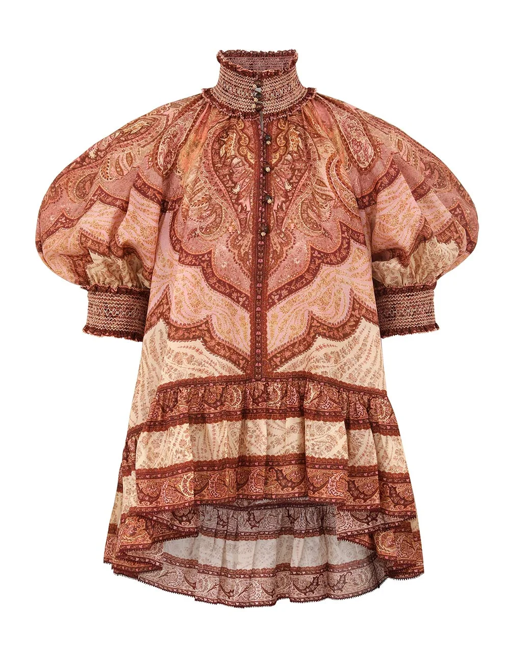 ITEM DETAILS The Wanderlust Frill Blouse in Tapestry Burgundy Multi from our Resort Swim 2026 Collection. A silk blouse featuring a shirred stand collar, centre front buttons, short billow sleeves, finished with a frilled asymmetric hem. - 100% silk habutae fabric - High-low hem - Rouleau button detailing at collar and centre front - Fitted shirred cuffs - Placement printed Style Code: 5655TRS262 SIZE DETAILS 0P 0 1 2 3 4 Length 20.5 21.5 22 22.5 22.5 23 Bust 48 50.5 52 54.5 56 58.5 Sleeve 16.5 17.5 17.5 18 18 19 Designed for a relaxed fit This garment fits true to size Available in size 0P, suited to clients who are under 5'3"/ 160cm Model is 5'9.5"/178 cm, bust size 32C/10C and wears a size 0 Item measurements are in inches CARE INSTRUCTIONS Main: 100% silk Dry clean only code f (hydrocarbon only); Remove any detachable trims prior to dry cleaning; Cover to protect trim; Iron in low temperature with protective cloth; Light steam only; Do not spot clean Always check the label or care card for specific care instructions.