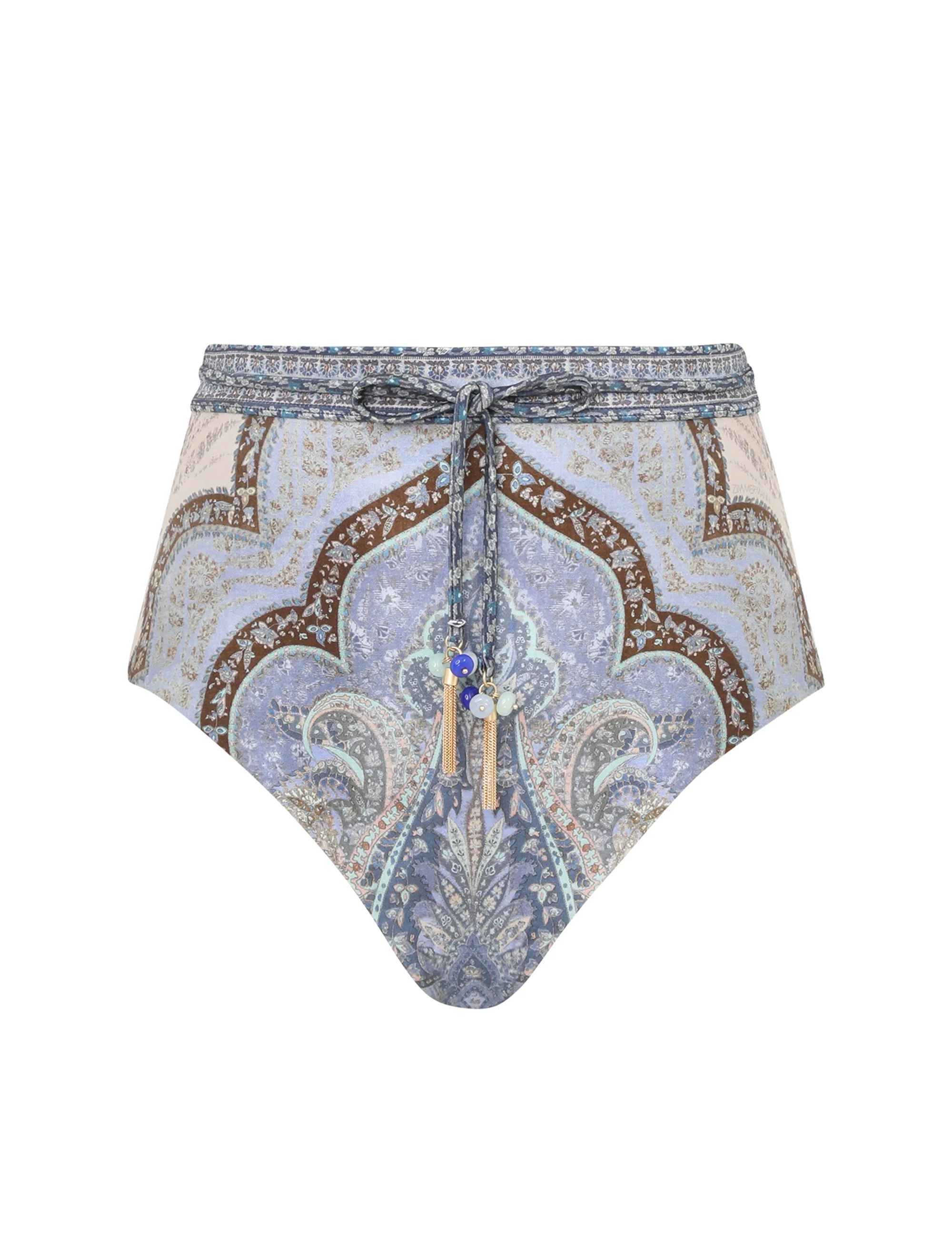 ITEM DETAILS The Wanderlust High Waist Pant in Tapestry Blue Multi from our Resort Swim 2026 Collection. A high waisted bikini pant constructed from form-fitting lycra featuring full bottom coverage and a removable rouleau waist belt. - Lycra with shiny finish - High waisted bikini pant - Self-tie waist with toggle ends - Lined - Pant only, bra sold separately Style Code: 5827WRS262 SIZE DETAILS This garment fits true to size Model is 5'10.5"/179 cm, bust size 34C/12C and wears a size 0 CARE INSTRUCTIONS Main: 80% polyamide, 20% elastane; lining: 92% recycled nylon, 8% elastane Do not roll up when wet; Rinse immediately after use; Remove any detachable trims prior to washing; Cold hand wash separately with mild detergent, avoid fabric softener; Dry in shade; Do not bleach or iron; Do not tumble dry; Do not dry clean; Light colours may be transparent when wet; Avoid contact with sunscreens, oils, rough surfaces, and high temperature pools and spas; Always check the label or care card for specific care instructions.