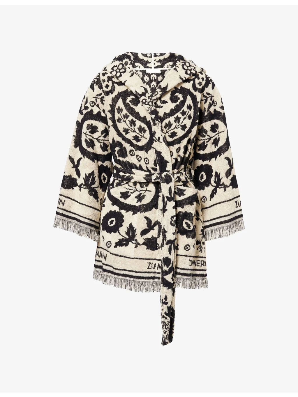 PRODUCT DETAILS - Zimmermann cotton cover-up dress - 100% cotton - Self-tie fastening - Regular fit, hood, shawl collar, long sleeves, two patch pockets at front, belt loops, detachable belt, all-over graphic print, all-over towelling texture, fringed trims - Hand wash cold - Made in Portugal - True to size - Model is 5ft 10in / 1.78m and wears a size 0 - Midweight, stretchy Ref: R04555149