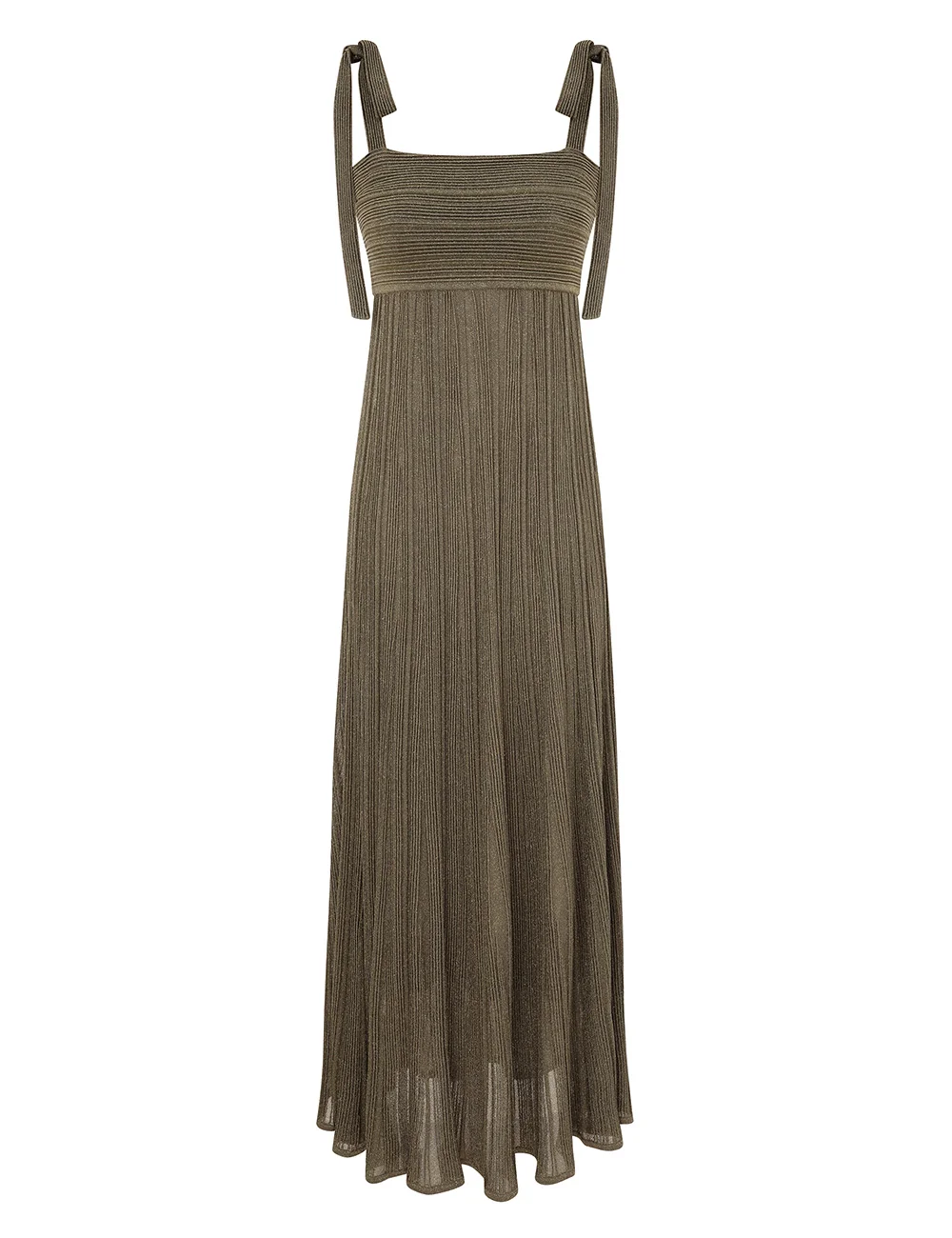 ITEM DETAILS The Wanderlust Metallic Maxi Dress in Metallic Olive from our Resort Swim 2026 Collection. A knit midi dress featuring self-tie straps and a pleated skirt. - Sleeveless midi-length dress - Square neckline - Ribbed at bust - Bow tie straps - Gathered skirt Style Code: 4311DRS262 SIZE DETAILS 0P 0 1 2 3 4 Length 39 42 42 42 42.5 42.5 Bust 24.5 26 28.5 30.5 32.5 34.5 Waist 23.5 25 27.5 30 31.5 34 Designed for a regular fit Mid-weight, stretchy knitted fabric This garment fits true to size Available in size 0P, suited to clients who are under 5'3"/ 160cm Model is 5'9.5"/178 cm, bust size 32C/10C and wears a size 0 Item measurements are in inches CARE INSTRUCTIONS 89% viscose, 6% metallic, 5% nylon Dry clean only code f (hydrocarbon only) Remove any detachable trims prior to dry cleaning Cover to protect trim Iron in low temperature with protective cloth Do not spot clean Store garment flat do not hang Always check the label or care card for specific care instructions.
