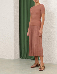 ITEM DETAILS The Wanderlust Metallic Tee in Metallic Dusty Rose from our Resort Swim 2026 Collection. A knit tee featuring a crew neckline, short sleeves and ribbed detailing throughout. - Round neckline - Short fitted sleeves - All-over ribbed detailing Style Code: 4127TRS262 SIZE DETAILS 0P 0 1 2 3 4 Length 20 21.5 21.5 22 22 22.5 Bust 17.5 19 21.5 23.5 25 27.5 Waist 15 16.5 19 21.5 23 25 Sleeve 8.5 8.5 9 9 9.5 9.5 Designed for a regular fit Mid-weight, stretchy knitted fabric This garment fits true to size Available in size 0P, suited to clients who are under 5'3"/ 160cm Model is 5'9.5"/178 cm, bust size 32C/10C and wears a size 0 Item measurements are in inches CARE INSTRUCTIONS 63% viscose, 29% polyamide, 8% metallized fibre Dry clean only code f (hydrocarbon only); Remove any detachable trims prior to dry cleaning; Cover to protect trim; Iron in low temperature with protective cloth; Do not spot clean; Store garment flat do not hang Always check the label or care card for specific care instructions.