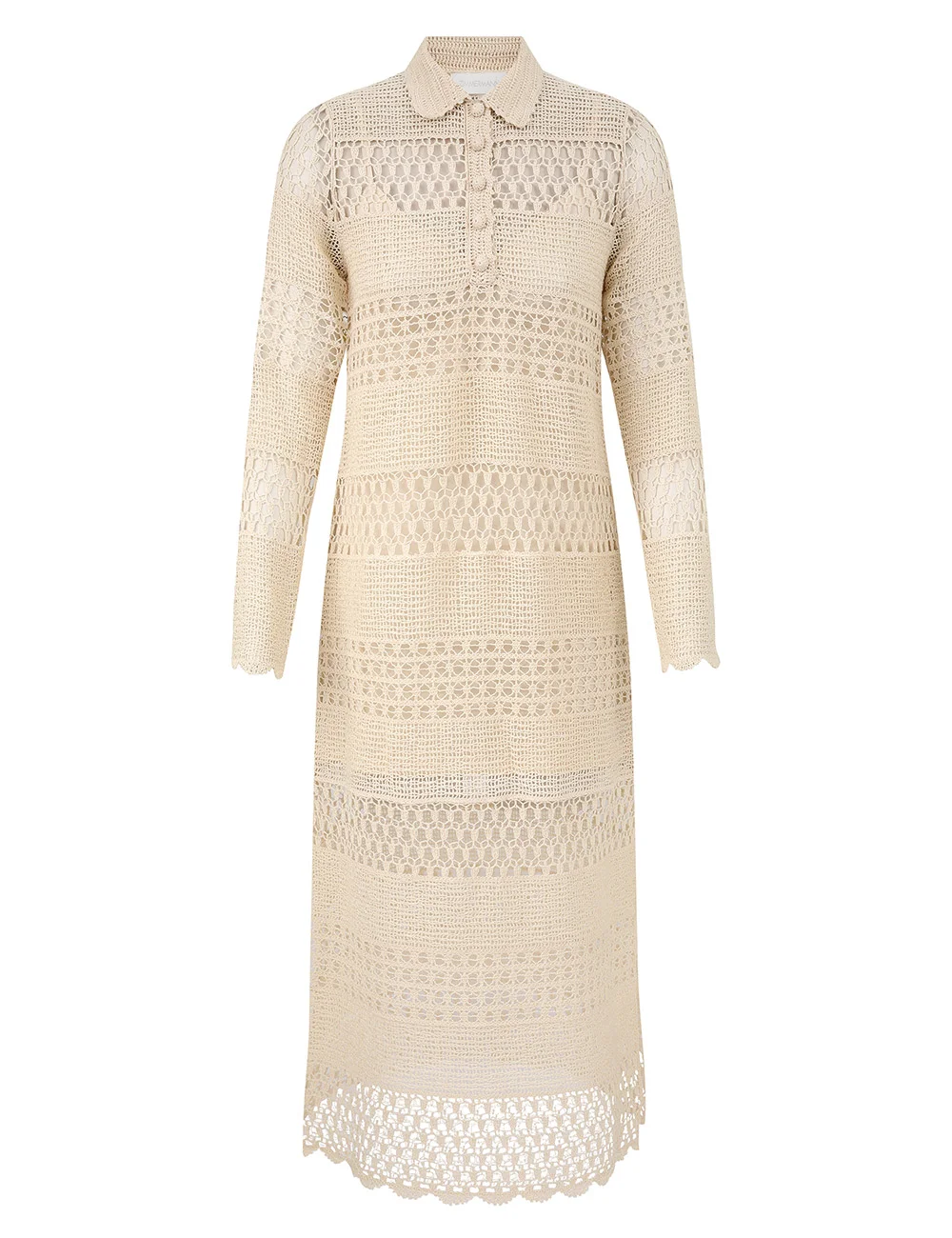 ITEM DETAILS The Wanderlust Sun Crochet Maxi in Natural from our Resort Swim 2026 Collection. A knit maxi dress featuring a classic collar, centre front buttons, long raglan sleeves and scalloped trim. - Crochet knit maxi-length dress - Buttons down the centre front opening - Long sleeves with wide cuffs - Scalloped trim - Comes with a separate slip Style Code: 6276DRS262 SIZE DETAILS 0P 0 1 2 3 4 Length 45.5 49 49.5 50 50 50.5 Bust 32.5 34 36 38.5 40 42.5 Waist 32.5 34.5 37 38.5 41 42.5 Hip 34.5 36 38.5 41 42.5 45 Sleeve 21.5 23 23.5 24 24 24.5 Designed for a relaxed fit Crocheted, stretchy fabric This garment fits true to size Available in size 0P, suited to clients who are under 5'3"/ 160cm Model is 5'9.5"/178 cm, bust size 32C/10C and wears a size 0 Item measurements are in inches CARE INSTRUCTIONS 83% cotton, 9% polyester,8% polyamide Dry clean only code f (hydrocarbon only) Remove any detachable trims prior to dry cleaning Cover to protect trim Iron in low temperature with protective cloth Do not spot clean Store garment flat do not hang Gentle cold hand wash separately with mild detergent Do not bleach Dry in shade Iron in low temperature with protective cloth Do not tumble dry Dry cleanable code f (hydrocarbon only) Always check the label or care card for specific care instructions.