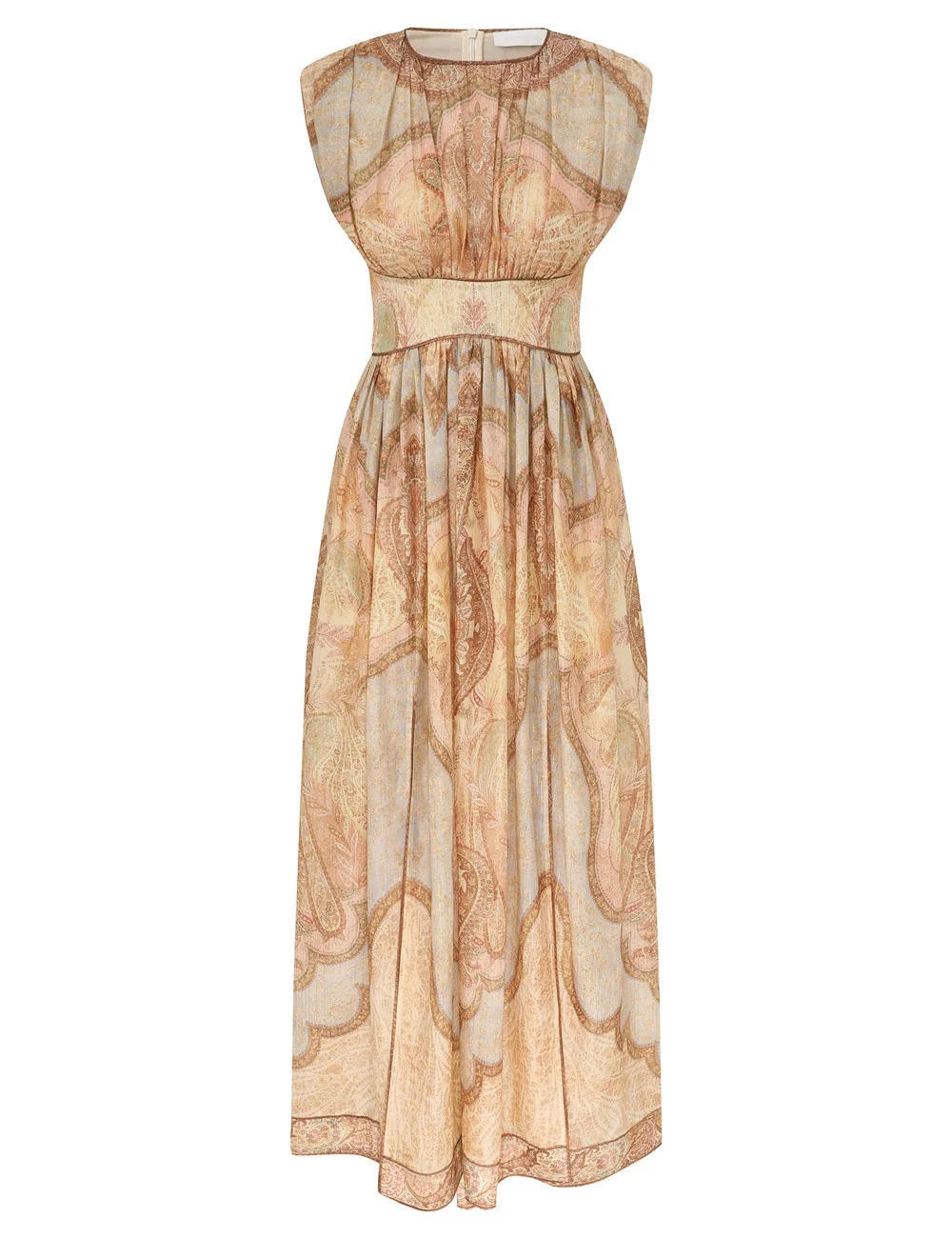 ITEM DETAILS The Wanderlust Waisted Dress in Tapestry Multi from our Resort Swim 2026 Collection. A cotton-silk maxi dress featuring a rounded neckline, fixed waistband, heavy gathering at the neckline and waist, finished with front skirt splits and a centre back zip. - Cotton-silk blend fabric - Sleeveless maxi gown - Structured, fitted waistband - Heavily gathered - Shirred centre back bodice with invisible zip closure - Short skirt lining Style Code: 5514DRS262 SIZE DETAILS 0P 0 1 2 3 4 Length 52.5 57 57.5 57.5 58 58.5 Bust 27 28.5 30 32.5 34 36 Length 52.5 57 57.5 57.5 58 58.5 Bust 27 28.5 30 32.5 34 36 Slightly fitted at the bust and waist, loose at the hip Light-weight, non-stretchy fabric This garment fits true to size Available in size 0P, suited to clients who are under 5'3"/ 160cm Model is 5'9.5"/178 cm, bust size 32C/10C and wears a size 0 Item measurements are in inches""0P, 0, 1, 2, 3, 4 Item measurements are in inches CARE INSTRUCTIONS Main: 72% cotton, 25% silk, 3% metallised fibre; lining: 100% cotton Dry clean only code f (hydrocarbon only); Remove any detachable trims prior to dry cleaning; Cover to protect trim; Iron in low temperature with protective cloth; Light steam only; Do not spot clean Always check the label or care card for specific care instructions.