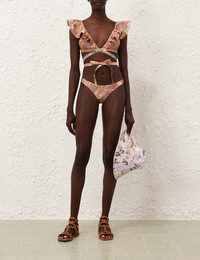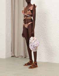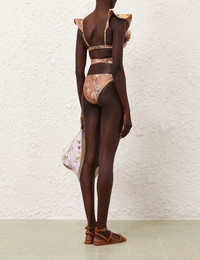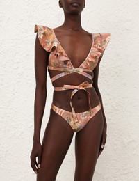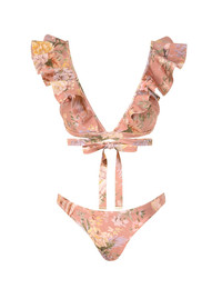 ITEM DETAILS The Tallow Wrap Ruffle Bikini in Tropical Oasis Pink from our Resort Swim 2025 Collection. An Italian lycra bikini featuring a triangle top with ruffles and waist wrap ties and a classic low rise pant. - Italian lycra - Frilled bikini top with self wrap waist ties - Removable cups - Classic low rise pant Style Code: 2505WRS253 SIZE DETAILS This garment fits true to size Model is 5'10.5"/179 cm, bust size 34C/12C and wears a size 0 CARE INSTRUCTIONS Main: 80% polyamide, 20% elastane, lining: 92% polyamide, 8% elastane Do not roll up when wet; Rinse thoroughly after use; Cold hand wash separately with mild detergent, avoid fabric softener; Dry in shade; Do not bleach or iron; Do not tumble dry; Do not dry clean; Light colours may be transparent when wet; Avoid contact with suntan lotions, oils and rough surfaces; Avoid high temperature pools and spas treated with harsh chemicals; Always check the label or care card for specific care instructions.