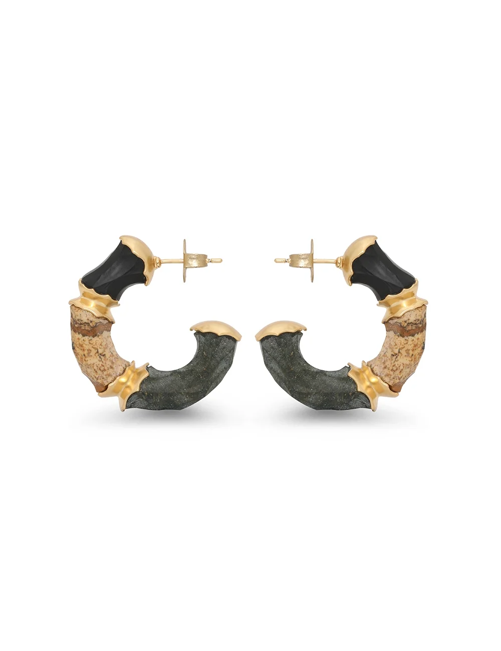 ITEM DETAILS The Wisp Hoops in Antique Gold/Multi from our Cruise 2026 Collection, Twisted Romance. A gold plated statement earring featuring twisted brass detailing and a stud post back. - 16KT gold plated brass hoops - Bamboo carved stone earrings - Enamel detailing in green hues - Stud post back - Sold as a pair - Hand-cut semi-precious stones, variations may occur Style Code: 6822XC26A1 SIZE DETAILS Suitable for pierced ears. Sold as a pair. CARE INSTRUCTIONS Stone: onyx; stone 2: picture jasper; stone 3: quartzite; hardware:16 karat gold plated brass; post: stainless steel Our semi-precious stones are hand-cut to enhance their natural beauty, with unique variations in each piece Zimmermann jewellery is made from 16kt gold-plated brass Please remove during exercise, showering, or swimming Keep away from perfumes, acetones, creams, and water to prevent damage or discoloration Clean gently with a soft, lint-free clothavoid cleaning products Store in a cool, dry place, away from direct sunlight and heat Always check the label or care card for specific care instructions.