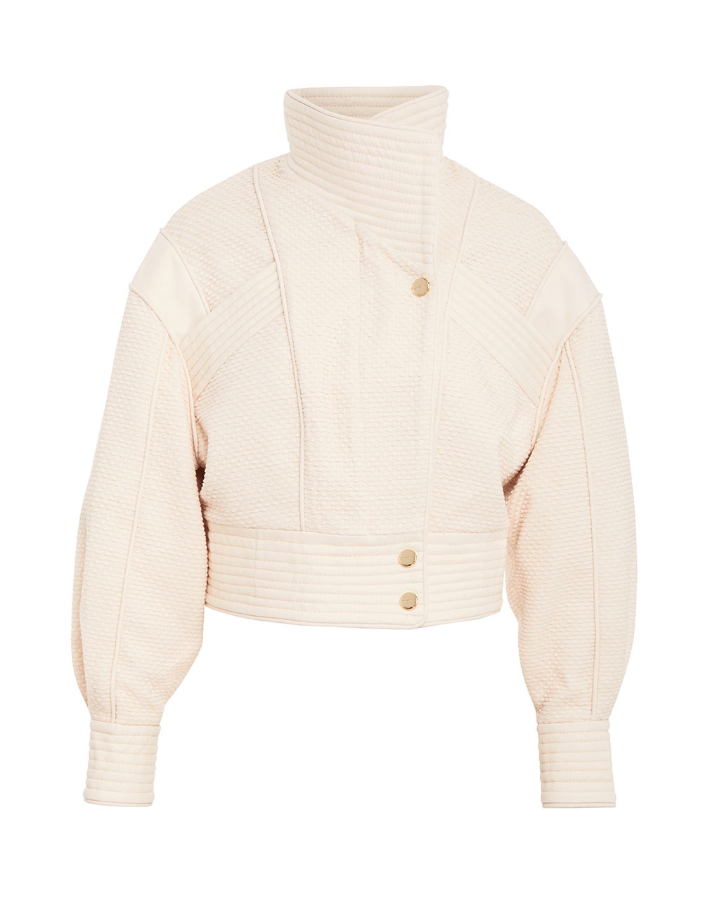 ITEM DETAILS The Wonderland Crop Jacket in Ecru from our Spring 2023 Collection, Wonderland. A nepped denim jacket featuring piped detailing throughout and lacing on the back. - Nepped denim jacket - Metal front zip - Branded snap closures - Oversized fit Style Code: 6156JWON STYLING The Wonderland Crop Jacket appeared in look 8 of the Spring 2023 Runway. Style the jacket with the Wonderland Frill Skirt, Solitaire Thin Huggie and Frayed Towel Sneaker to complete the runway look. SIZE DETAILS 0P 0 1 2 3 Length 45 45 49 50 50 Bust 90 90 96 102 106 Sleeve 52 56 56 57 57 This garment fits true to size, we recommend you select your normal size. Structured fit, those who want to layer this style may wish to size up. Available in size 0P, specially designed with petite proportions that are suited to clients who are under 5'3""/ 160cm. Our model is 5'9.5"" / 178 cm, bust size 32C/10C and is wearing a size 0. CARE INSTRUCTIONS Main: 85% cotton 14% polyamide 1% elastane Lining: 100% cotton Exclusive of trims Dry clean only code f with protective bag Cool iron with protective cloth Light steam only Do not spot clean Cover and protect hardware Turn garment inside out Before dry cleaning Always check the garment care label for specific care instructions.