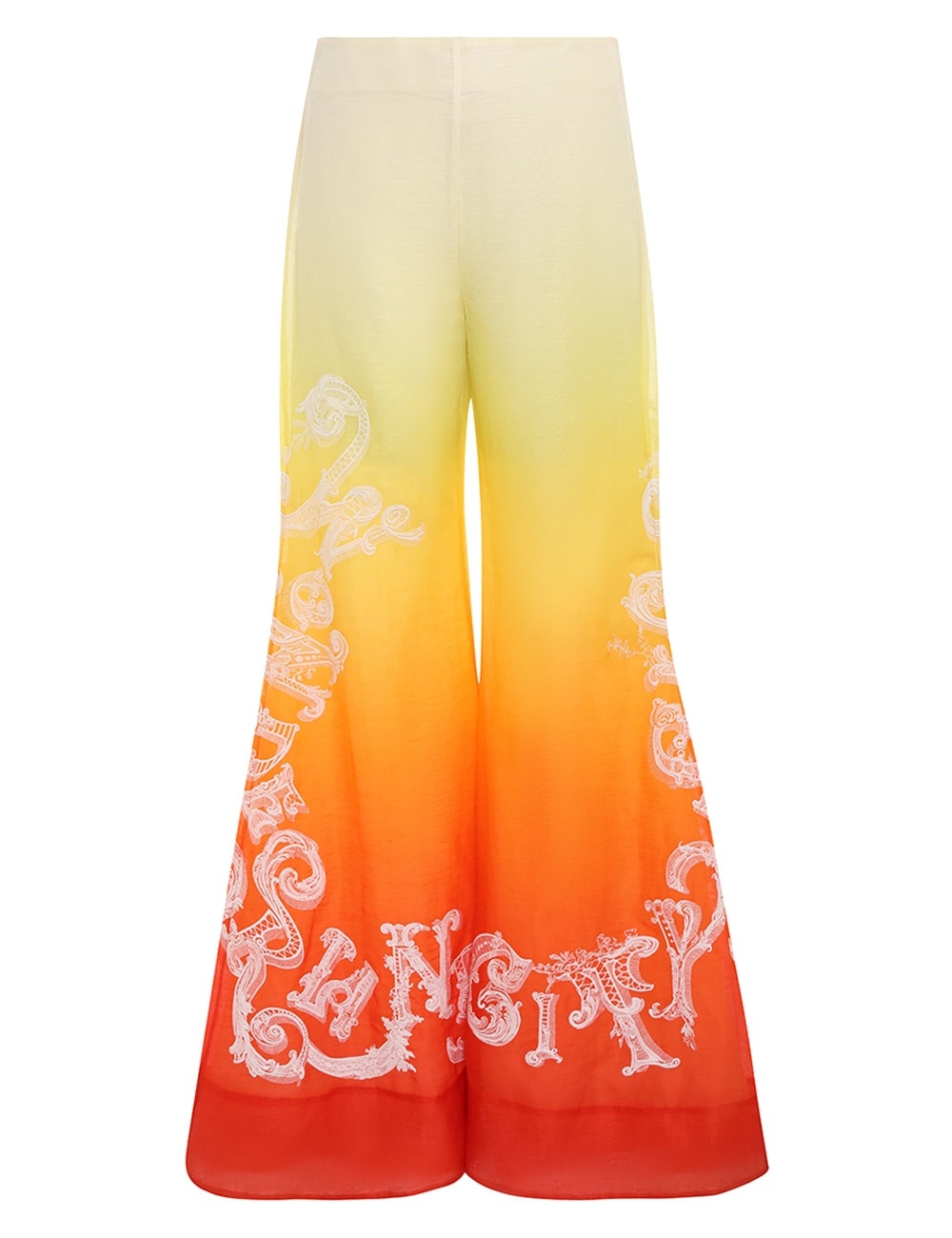 ITEM DETAILS The Wonderland Long Pant in Sunset Ombre from our Spring 2023 Collection, Wonderland. A silk linen pant featuring a mid rise, flare silhouette and embroidered lettering throughout. - Silk linen pant - Mid rise - Flare leg - Embroidered lettering throughout - Invisible zip closure Style Code: 7055PWON STYLING The Wonderland Long Pant appeared in look 22 of the Spring 2023 Runway. Style the pant with the Wonderland Waterfall Dress, Tangled Collage Earrings and Embellished Sandal 85 to complete the runway look. SIZE DETAILS 0P 0 1 2 3 Length 106 106 118 118 119 Waist 72 76 80 86 88 Hip 92 96 102 106 112 This garment fits true to size, we recommend you select your normal size. Fitted waistband, relaxed though the leg. Available in size 0P, specially designed with petite proportions that are suited to clients who are under 5'3""/ 160cm. Our model is 5'9.5"" / 178 cm, bust size 32C/10C and is wearing a size 0. CARE INSTRUCTIONS Main: 52% linen 48% silk Lining: 100% cotton Exclusive of trims Dry clean only code f with protective bag Cool iron with protective cloth Light steam only Do not spot clean Turn garment inside out before dry cleaning Always check the garment care label for specific care instructions.