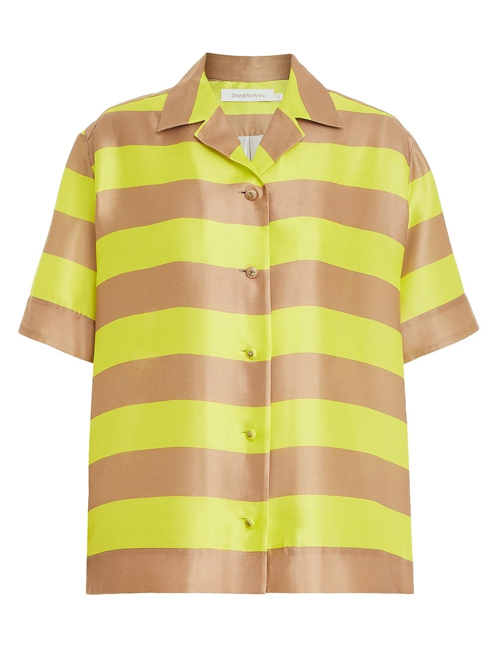 ITEM DETAILS The Wonderland Short Sleeve Shirt in Lime Stripe from our Spring 2023 Collection, Wonderland. A silk shirt featuring a relaxed silhouette and wide short sleeves. - Silk shirt - Oversized fit - Classic collar - Buttons down the centre front Style Code: 6581TWON STYLING Style the Wonderland Short Sleeve Shirt with the Wonderland Relaxed Kick Flare, Link Shoulder bag and Jelly Bow Sandal for a fun look for your next outing with friends. Wear this style with the Twisted Rope Cuff, Metallic Platform Sandal and Wonderland Relaxed Kick Flare by ZIMMERMANN SIZE DETAILS 0P 0 1 2 3 Length 64 64 68 69 70 Bust 128 128 134 140 144 Waist 118 124 128 134 138 Sleeve 25 27 27 28 29 This garment fits true to size, we recommend you select your normal size. Relaxed fit. Available in size 0P, specially designed with petite proportions that are suited to clients who are under 5'3""/ 160cm. Our model is 5'9.5"" / 178 cm, bust size 32C/10C and is wearing a size 0. CARE INSTRUCTIONS 100% silk Exclusive of trims Dry clean only code f with protective bag Cool iron with protective cloth Light steam only Do not spot clean Turn garment inside out before dry cleaning Always check the garment care label for specific care instructions.