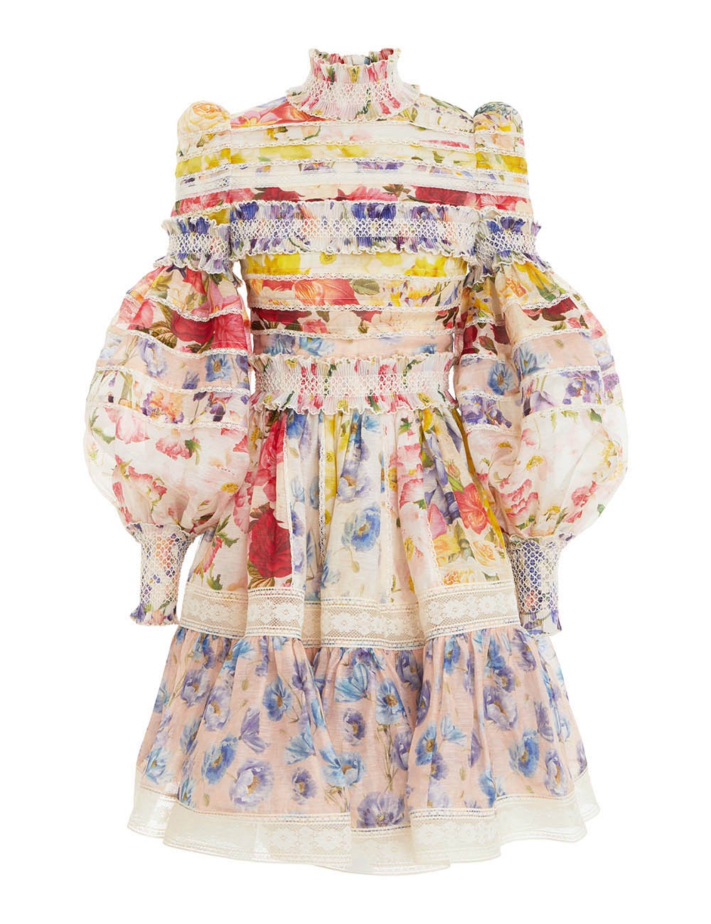 ITEM DETAILS The Wonderland Smocked Mini Dress in Spliced Multi Floral from our Spring 2023 Collection, Wonderland. A silk linen mini dress featuring long blouson sleeves, finished with a full skirt and lace trims throughout. - Silk linen mini dress - Spliced prints - Smocked sleeve cuffs - Crinoline tape hem - Invisible zip closure Style Code: 6655DWON STYLING Style the Wonderland Smocked Mini Dress with the Embellished Sandal 85 and Small Cross Body bag for your next event with friends. Wear this style with the Embellished Sandal 85 and Collage Chain Link Earrings by ZIMMERMANN SIZE DETAILS 0P 0 1 2 3 4 Length 58 58 94 96 97 99 Bust 116 88 92 98 104 108 Waist 62 68 70 76 82 86 Sleeve 76 80 80 81 82 82 This garment fits true to size, we recommend you select your normal size. Fitted through the bust and body, with no stretch. Available in size 0P, specially designed with petite proportions that are suited to clients who are under 5'3""/ 160cm. Our model is 5'9.5"" / 178 cm, bust size 32C/10C and is wearing a size 0. CARE INSTRUCTIONS Main: 53% linen 47% silk Contrast: 100% polyester Lining: 100% cotton Exclusive of trims Dry clean only code f with protective bag Cool iron with protective cloth Light steam only Do not spot clean Turn garment inside out before dry cleaning Always check the garment care label for specific care instructions.