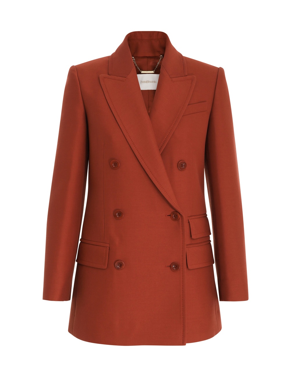 ITEM DETAILS The Wonderland Tailored Blazer in Sienna from our Spring 2023 Collection, Wonderland. A wool blend tailored blazer featuring front patch pockets and a double breasted closure. - Wool blend blazer - Tailored silhouette - Double breasted - Internal button closure - Buttons down sleeve cuff Style Code: 6510JWON STYLING Style the Wonderland Tailored Blazer with the Wonderland Wide Leg Pant and Jelly Bow Wedge 85 for your next evening with friends. Wear this style with the Embellished Sandal 85, Twisted Rope Cuff, Wonderland Tailored Pant and Wonderland Batwing Blouse by ZIMMERMANN SIZE DETAILS 0P 0 1 2 3 Length 70 70 75 76 76 Bust 88 92 98 104 108 Waist 84 88 94 98 104 Hip 96 102 106 112 118 Sleeve 57 61 61 62 63 This garment fits true to size, we recommend you select your normal size. Tailored fit. Available in size 0P, specially designed with petite proportions that are suited to clients who are under 5'3""/ 160cm. Our model is 5'9.5"" / 178 cm, bust size 32C/10C and is wearing a size 0. CARE INSTRUCTIONS Main: 65% wool 35% viscose Lining: 73% viscose 27% silk Exclusive of trims Dry clean only code f with protective bag Cool iron with protective cloth Light steam only Do not spot clean Cover and protect hardware Turn garment inside out before dry cleaning Always check the garment care label for specific care instructions.