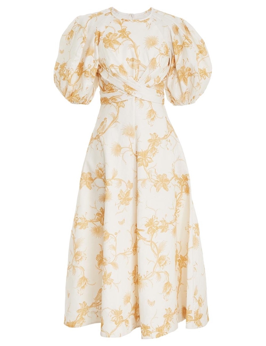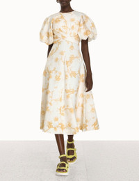 ITEM DETAILS The Wrap Midi Dress in Keira Tan from our Spring 2023 Collection, Wonderland. A linen midi dress featuring a fixed wrapped bodice with short blouson sleeves. - Linen midi dress - Fixed wrapped bodice - Short blouson sleeves with elastic cuffs - Side seam pockets - Invisible zip closure Style Code: 6883DRWON STYLING Style the Wrap Midi Dress with the Chunky Wavy Sandal and Triangle Section Hoop Earrings for your next day out with friends. Wear this style with the Chunky Wavy Sandal and Triangle Section Hoop Earrings by ZIMMERMANN SIZE DETAILS 0P 0 1 2 3 4 Length 108 108 118 119 120 120 Bust 82 88 92 98 104 108 Sleeve 43 46 46 47 48 49 Underbust 32 34 36 39 42 44 This garment fits true to size, we recommend you select your normal size. Fitted across bodice, relaxed through skirt. Available in size 0P, specially designed with petite proportions that are suited to clients who are under 5'3""/ 160cm. Our model is 5'9.5"" / 178 cm, bust size 32C/10C and is wearing a size 0. CARE INSTRUCTIONS Main: 100% linen Exclusive of trims Dry clean only code p with protective bag Cool iron on reverse Do not spot clean Always refer to garment care label for specific care instructions