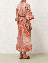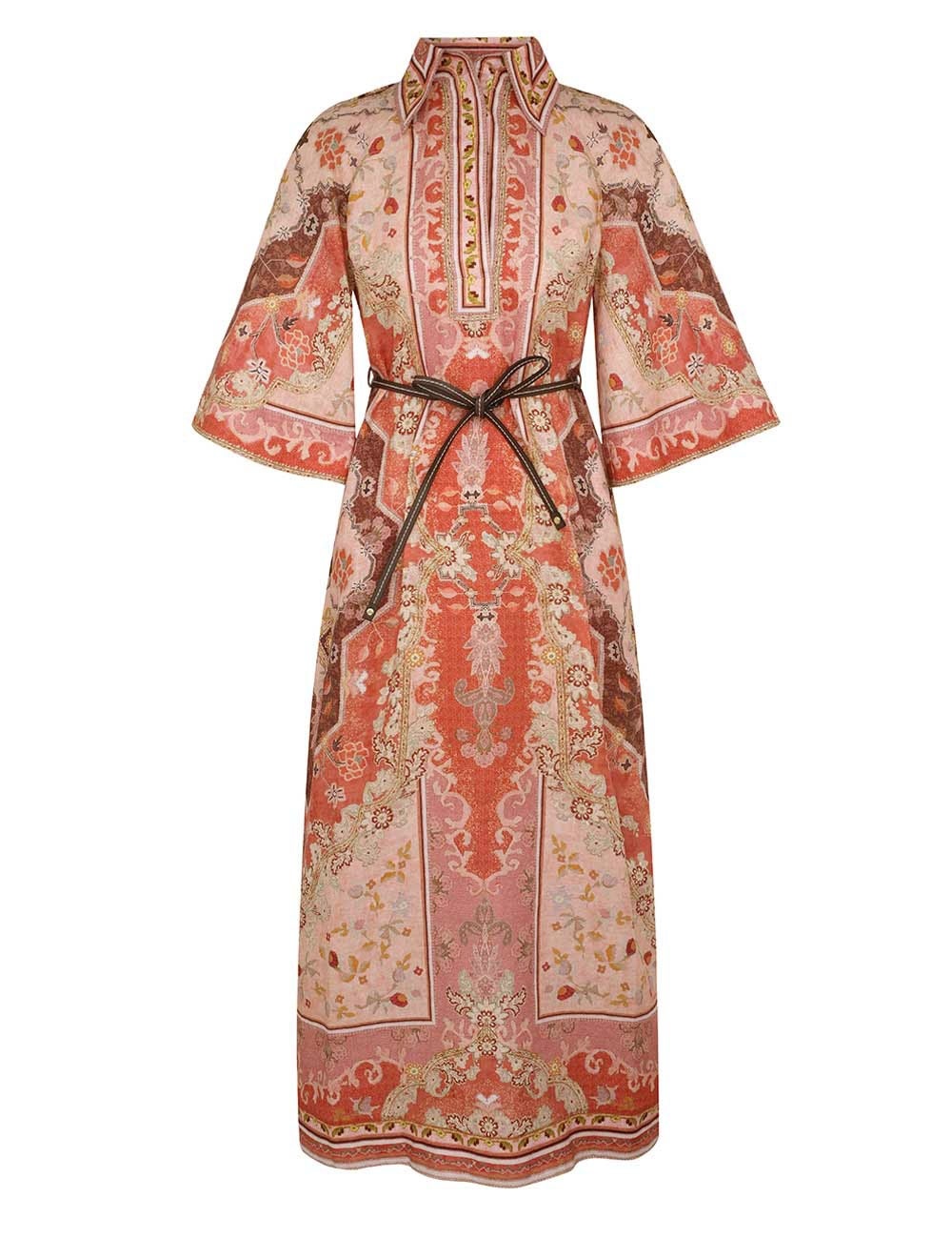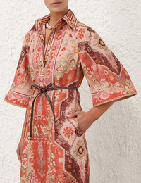 ITEM DETAILS The Wylie Tunic Midi Dress in Rust Multi from our Resort Swim 2025 Collection. A linen tunic midi dress featuring a deep V-neckline, wide sleeves and placement print throughout. - Linen mini dress - Side seam pockets - Classic collar - Deep V-neckline - Topstitching throughout - Removable leather belt Style Code: 1330DRS251 SIZE DETAILS 0P 0 1 2 3 4 Length 47.5 52 52 52.5 53 53 Waist 35.5 37 39.5 41 43.5 45 Sleeve 19 21 21.5 21.5 22 22.5 Relaxed fit throughout This garment fits true to size Available in size 0P, suited to clients who are under 5'3"/ 160cm Model is 5'9.5"/178 cm, bust size 32C/10C and wears a size 0 Item measurements are in inches CARE INSTRUCTIONS Main: 100% linen Dry clean code f (hydrocarbon only), inside out in a protective bag; Remove detachable trims and accessories prior to cleaning; Cover to protect hardware; Cool iron with protective cloth; Do not spot clean; Always check the label or care card for specific care instructions.