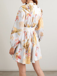 Zimmermann's 'Ascension' dress is printed with tropical leaves, birds and dragonflies - just perfect for sunny vacations. It's cut from linen with billowing sleeves and a flared mini hem. The waist is gently cinched to emphasize your figure. Lower-Impact Materials. This product is made using at least 50% lower-impact materials or ingredients. Find out more about our NET SUSTAIN criteria here. Size & Fit - 00 = UK 6/ US 2/ FR 34 - 0 = UK 8/ US 4/ FR 36 - 1 = UK 10/ US 6/ FR 38 - 2 = UK 12/ US 8/ FR 40 - 3 = UK 14/ US 10/ FR 42 - 4 = UK 16/ US 12/ FR 44 - Fits true to size, take your normal size - Designed to be fitted at the bust and waist, loose at the hip - Lightweight, non-stretchy fabric - Model is 177cm/ 5'10" and is wearing the designer's size 0 Model measurements: - Bust: 85cm/ 33” - Waist: 66cm/ 26” - Hip: 92cm/ 36” Details & Care - Multicolored linen - Concealed zip fastening along back - 100% linen; lining: 100% cotton - Green dry clean