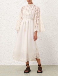 ITEM DETAILS The Ascension Lace Yoke Midi Dress in Cream from our Summer Swim 2025 Collection. A ramie midi dress featuring long, loose sleeves with lace trim, a stand collar and self rouleau buttons down the centre front, finished with a waist tie and frilled hem. - 100% ramie fabric - Long, wide sleeves - Lace trim detailing along collar, sleeves and hem - Removable self tie belt at waist - Invisible zip closure at center back - Comes with separate slip Style Code: 3402DSS253 SIZE DETAILS 0P 0 1 2 3 Length 46.5 51 51 51.5 51.5 Waist 48 49.5 52 53.5 56 Sleeve 23 25 25 25.5 26 Designed for a relaxed, loose fit This garment fits true to size Available in size 0P, suited to clients who are under 5'3"/ 160cm Model is 5'9.5"/178 cm, bust size 32C/10C and wears a size 0 Item measurements are in inches CARE INSTRUCTIONS Main: 100% ramie; contrast: 57% cotton, 43% polyamide; slip: 86% recycled polyester, 14% elastane Dry clean only code f (hydrocarbon only); Remove any detachable trims prior to dry cleaning; Cover to protect trim; Cool iron with protective cloth; Light steam only; Do not spot clean Gentle cold hand wash separately with mild detergent; Remove any detachable trims prior to cleaning; Cover to protect trim; Do not soak, rub or wring; Do not bleach; Dry in shade; Cool iron with protective cloth; Do not tumble dry; Do not spot clean; Dry cleanable code f (hydrocarbon only); Always check the label or care card for specific care instructions.