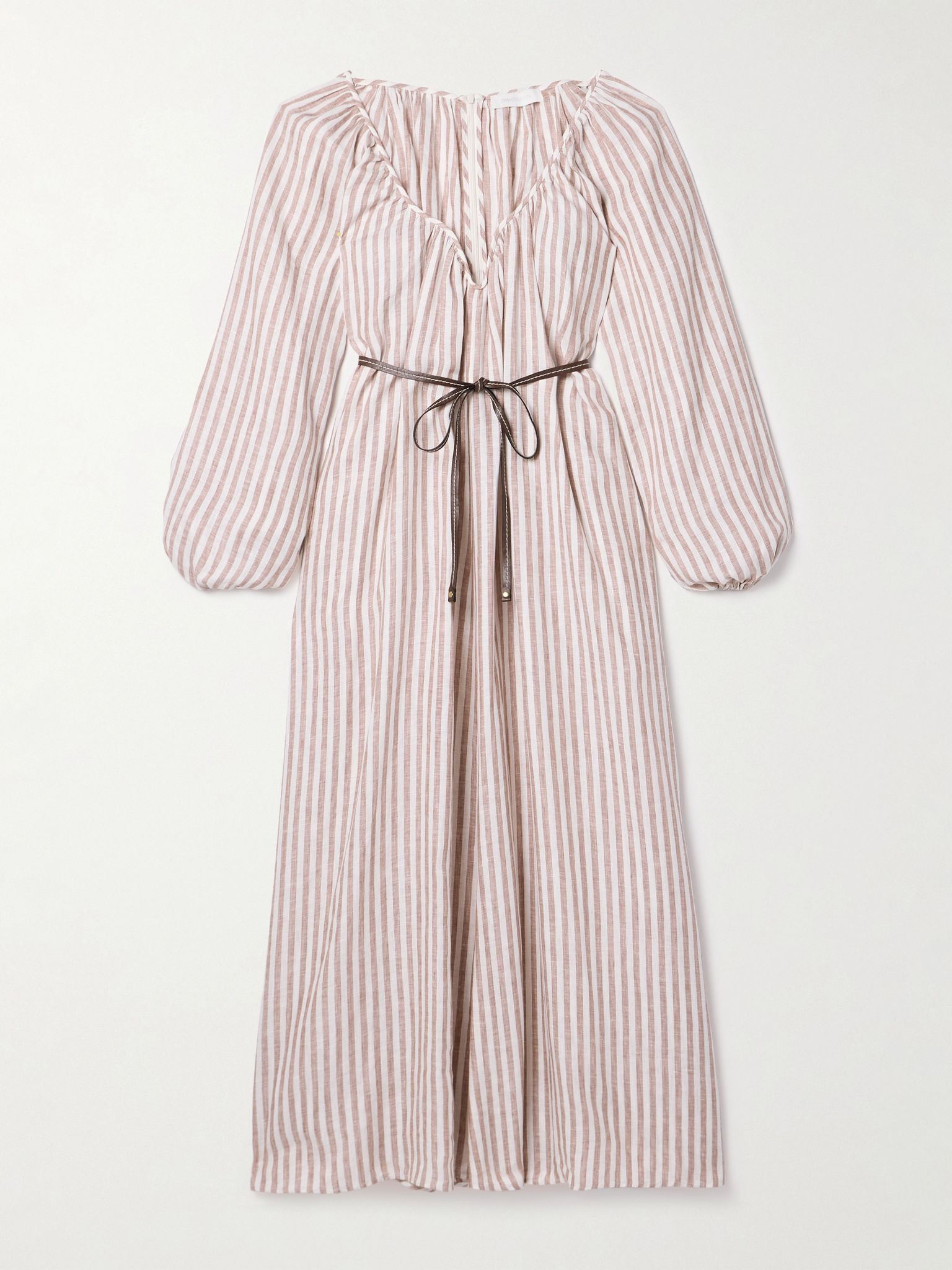 Zimmermann's effortless dress is perfect for balmy days in the city or on vacation. Part of the Fall '25 lineup, it's made from breathable striped linen and has billowy sleeves and a plunging neckline underpinned with a U-shaped ring for structure. Use the self-tie belt to cinch the fit. Size & Fit - 00 (petite) = UK 6/ US 2/ FR 34 (under 5’3”/ 160cm) - 0 = UK 8/ US 4/ FR 36 - 1 = UK 10/ US 6/ FR 38 - 2 = UK 12/ US 8/ FR 40 - 3 = UK 14/ US 10/ FR 42 - 4 = UK 16/ US 12/ FR 44 - Fits true to size, take your normal size - Intended for an oversized fit, cut to be worn very loose - Use the tie belt to cinch in at the waist - Lightweight, non-stretchy fabric - Model is 177cm/ 5'10" and is wearing the designer's size 0 Details & Care - Light-brown and ivory linen - Slips on - 100% linen