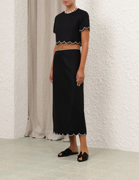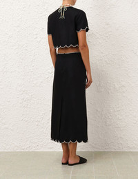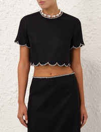 ITEM DETAILS The Crush Scalloped Top in Black from our Resort 2025 Collection, Crush. A linen crop top featuring a scalloped crystal trims around the sleeves and body hemline and a center back invisible zip closure. - Linen crop top - Crew neckline with crystal trim - Invisible centre back zip - Short sleeves - Lined Style Code: 2735TR251 SIZE DETAILS 0P 0 1 2 3 4 Length 38 40 41 41 42 43 Bust 91 96 101 106 111 116 Sleeve 19 20 21 21 22 22 Relaxed, cropped fit This garment fits true to size Available in size 0P, suited to clients who are under 5'3"/ 160cm Model is 5'9.5"/178 cm, bust size 32C/10C and wears a size 0 Item measurements have been rounded to the nearest cm CARE INSTRUCTIONS Main: 100% linen, lining: 100% cotton Dry clean code f (hydrocarbon only), inside out in a protective bag; Remove detachable trims and accessories prior to cleaning; Cover to protect hardware; Cool iron with protective cloth; Do not spot clean; Always check the label or care card for specific care instructions.