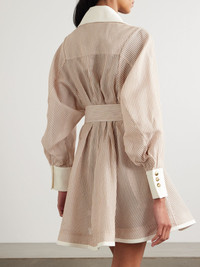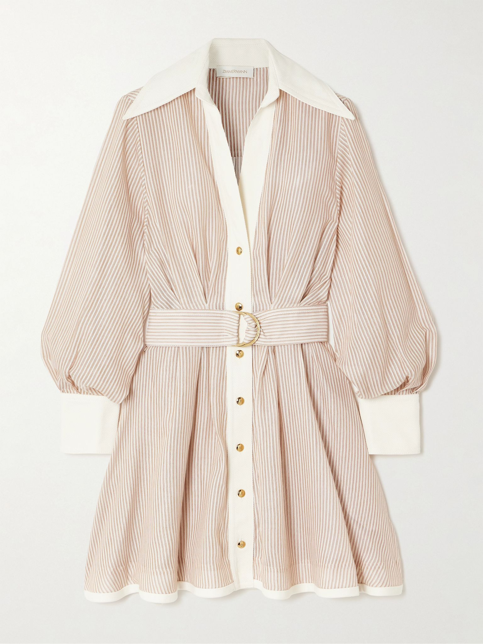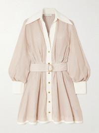 Trust Zimmermann to make shirting feel utterly feminine and graceful. Trimmed with cotton-twill, this cotton and silk-blend dress has a vintage-inspired wide collar, blouson sleeves and flares at the hem. Use the waist belt to cinch your curves. Size & Fit - 0 = UK 8/ US 4/ FR 36 - 1 = UK 10/ US 6/ FR 38 - 2 = UK 12/ US 8/ FR 40 - 3 = UK 14/ US 10/ FR 42 - 4 = UK 16/ US 12/ FR 44 - Fits true to size, take your normal size - Intended for a slightly loose fit, use the belt to cinch in at the waist - Mid-weight, non-stretchy fabric - Model is 175cm/ 5'9" and is wearing the designer's size 0 Model measurements: - Bust: 81cm/ 32" - Waist: 62cm/ 24.5" - Hip: 89cm/ 35" Details & Care - Ivory and light-brown cotton and silk-blend - Button fastenings through front - 85% cotton, 15% silk; trim: 100% cotton - Unlined - Dry clean