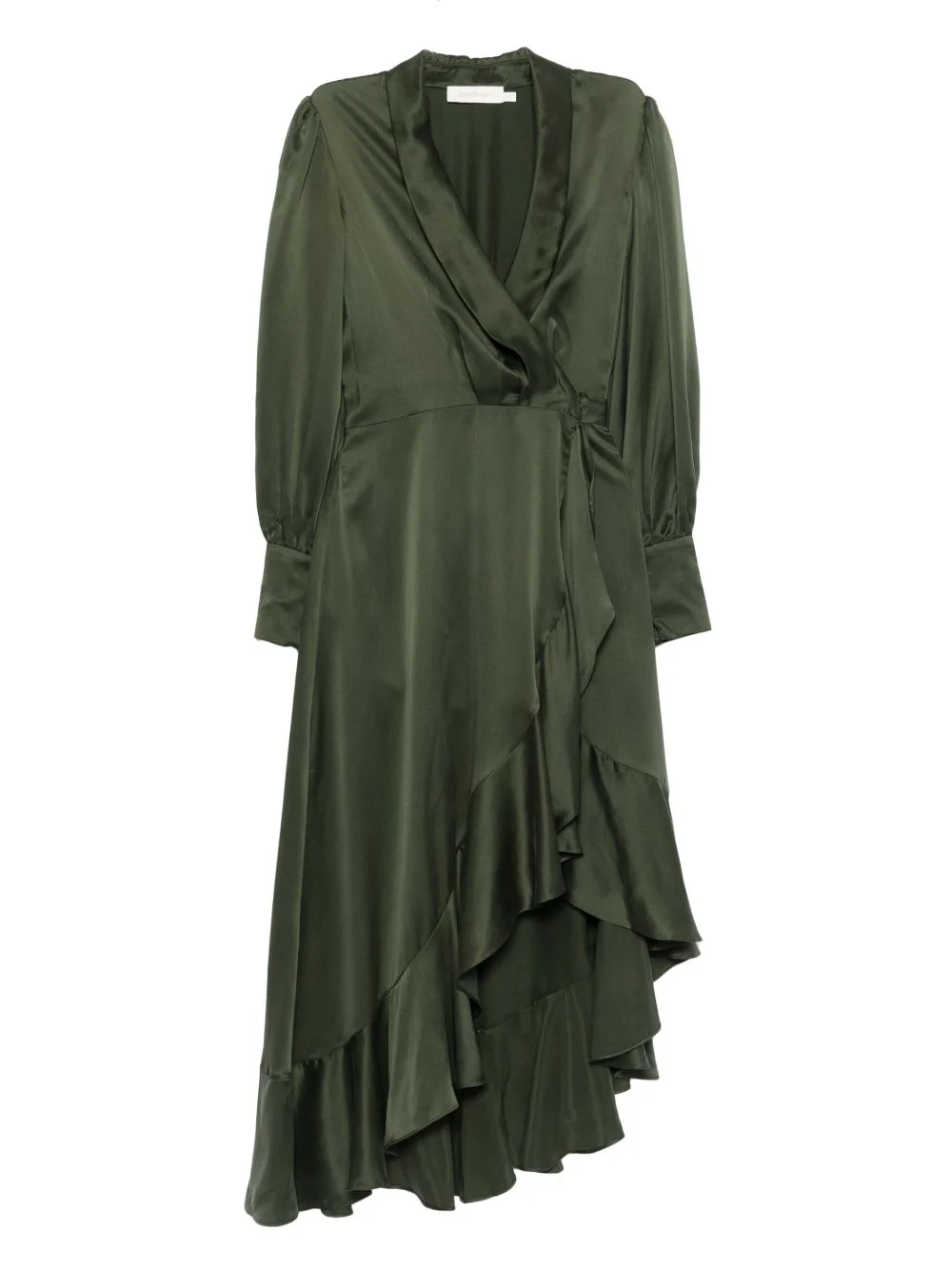ruffled wrap-style asymmetric dress Highlights - Green - Wrap style - V-neck - Long sleeves - Asymmetric hem - Ruffle detail Imported Composition Silk 100% SIZE & FIT Model measurements Height 5 ft 11 in(1.8 m) Bust/Chest 32.28 in(82 cm) Hips 36.22 in(92 cm) Waist 25.19 in(64 cm) Washing instructions Dry Clean Only