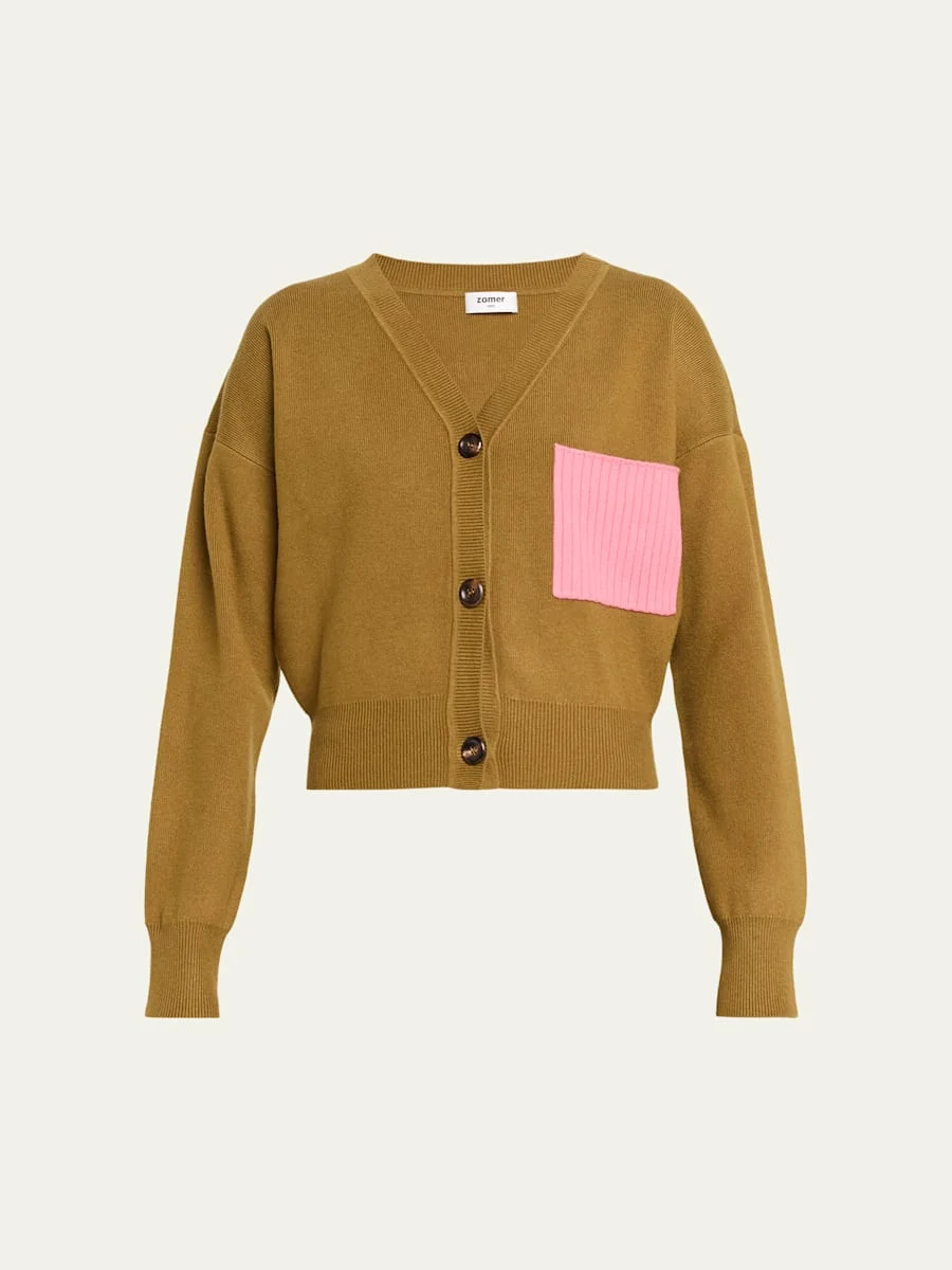 Zomer cardigan is crafted from ribbed knit accented with a colorblocked wide ribbed patch pocket on the chest V neckline; button front Long sleeves Drop shoulders Relaxed fit Cropped length Ribbed cuffs and hem Acrylic/nylon/polyamide Imported