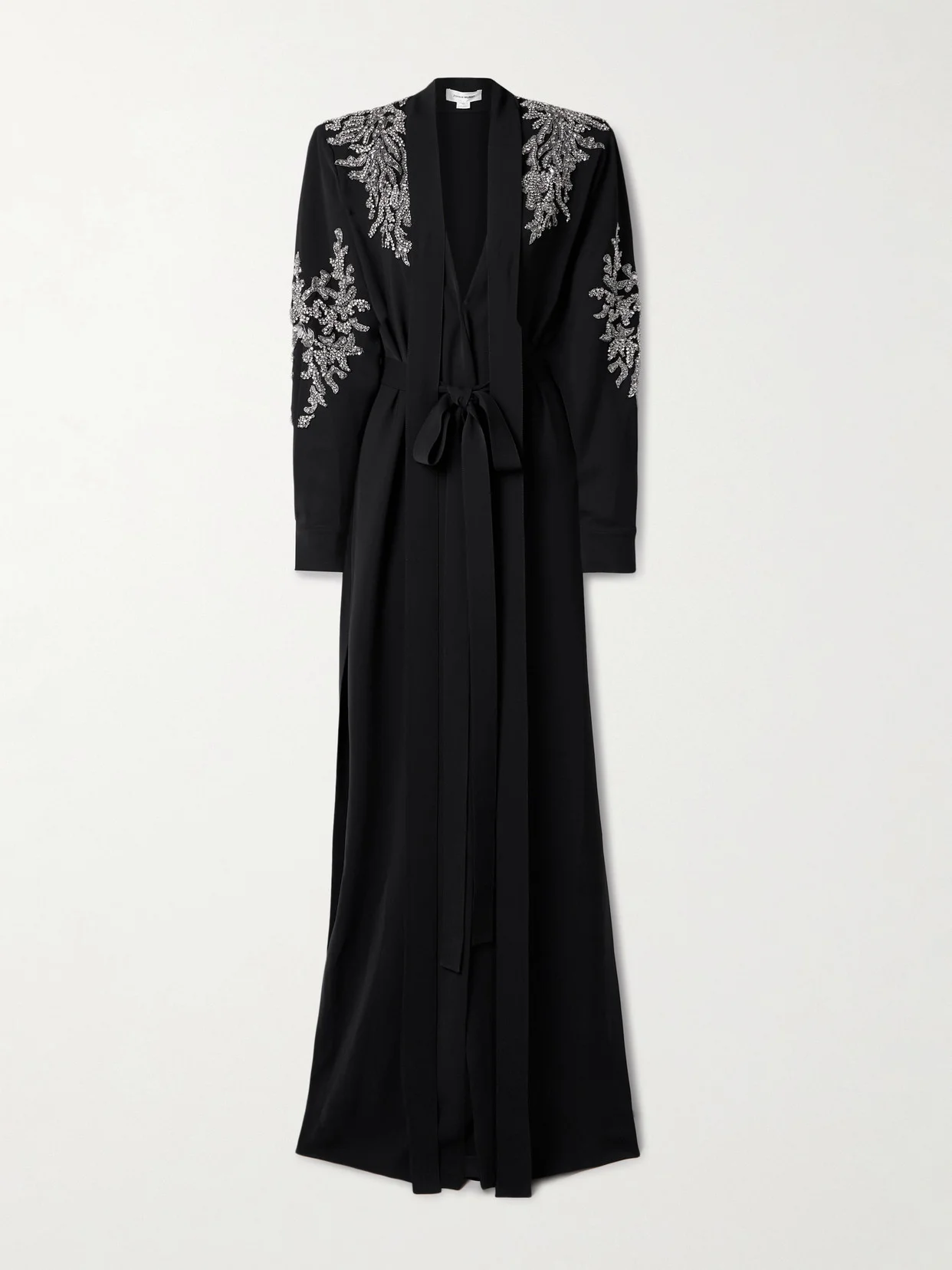 Intricacy and impeccable detail are hallmarks of Zuhair Murad's eveningwear, making it a natural fit for the red carpet. This gown is cut from crepe decorated with crystals, beads and sequins along the padded shoulders and blouson sleeves. It has a plunging V-neckline framed by elongated ties and comes with a belt to cinch the waist.
