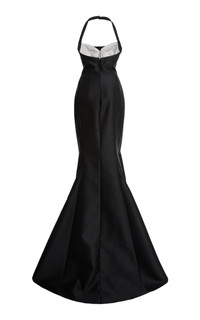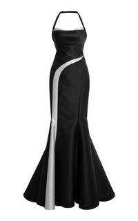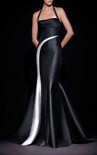 PRODUCT DETAILS - Slim fit, square neckline and halter straps, with contrast colored curved detailing, mermaid silhouette - Zip Closure Through Back - Lined - Composition: 100% Polyester Secondary: 100% Polyamide Lining: 100% Polyester - Color: Black / White - Dry Clean Only - Pre-Fall '25