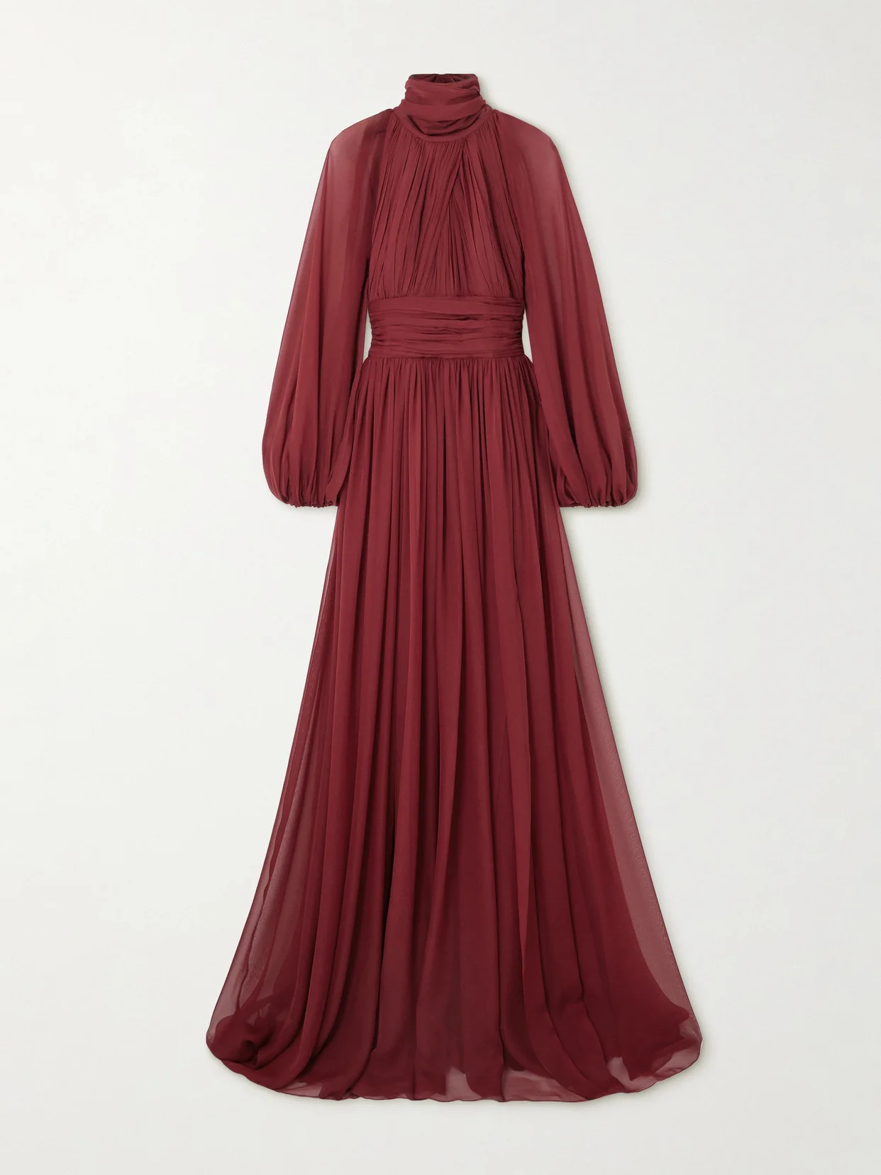 Zuhair Murad's gown is cut from silk-chiffon that's pleated to create texture through the fitted bodice and movement through the floaty skirt. It's topped with a turtleneck and has billowy, sheer sleeves and a defined waist. The dramatic split reveals plenty of leg.