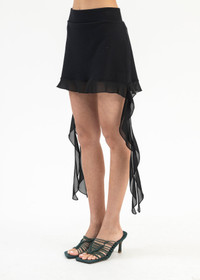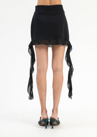 Ruched slim skirt in black, from Blumarine. Features a slim panelled construction with concealed zip fastening and Georgette ruffles along the hem and at either outseam. Finished with tonal stitching throughout. Regular fit Shell: 100% Cotton Detailing: 100% Polyester Imported Model is wearing size 36 Model is 5'6 (167 cm), 95 pounds (43 kg), usually wears XS in tops. A size 23 in denim and XS in trousers. Size 6.5 in shoes. *FINAL SALE*