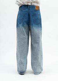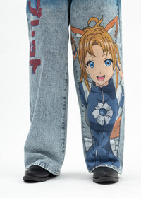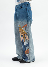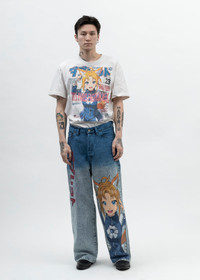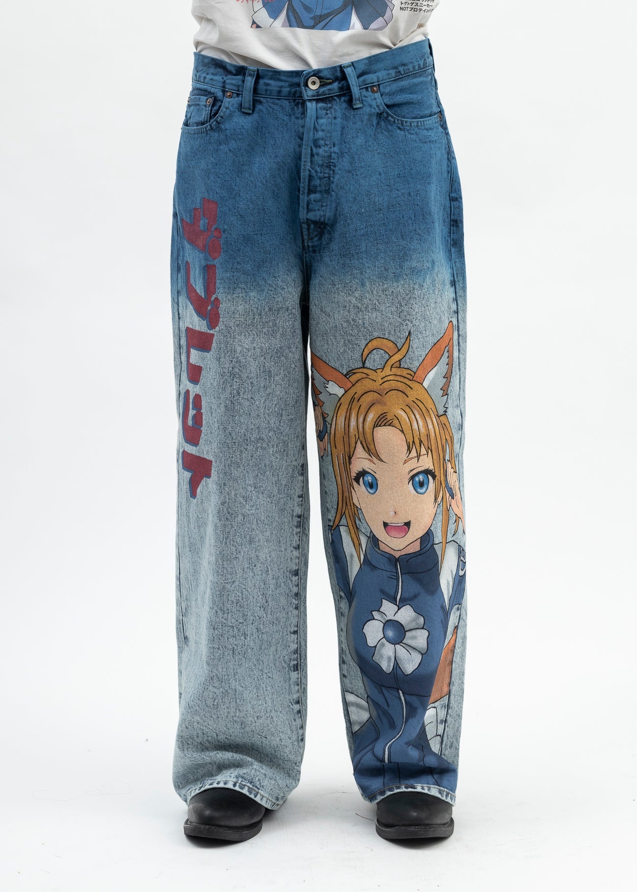 Jeans in blue. Paneled denim construction with hand-painted anime graphics and gradient dye. Faded wash with belt loops and back logo patch. Front button and concealed zip fly closure. Inset pockets, coin pocket, and back patch pockets. Straight leg with a loose fit. Standard Sizing 100% Cotton Made in Japan Model is 6'2" wearing size M. FINAL SALE
