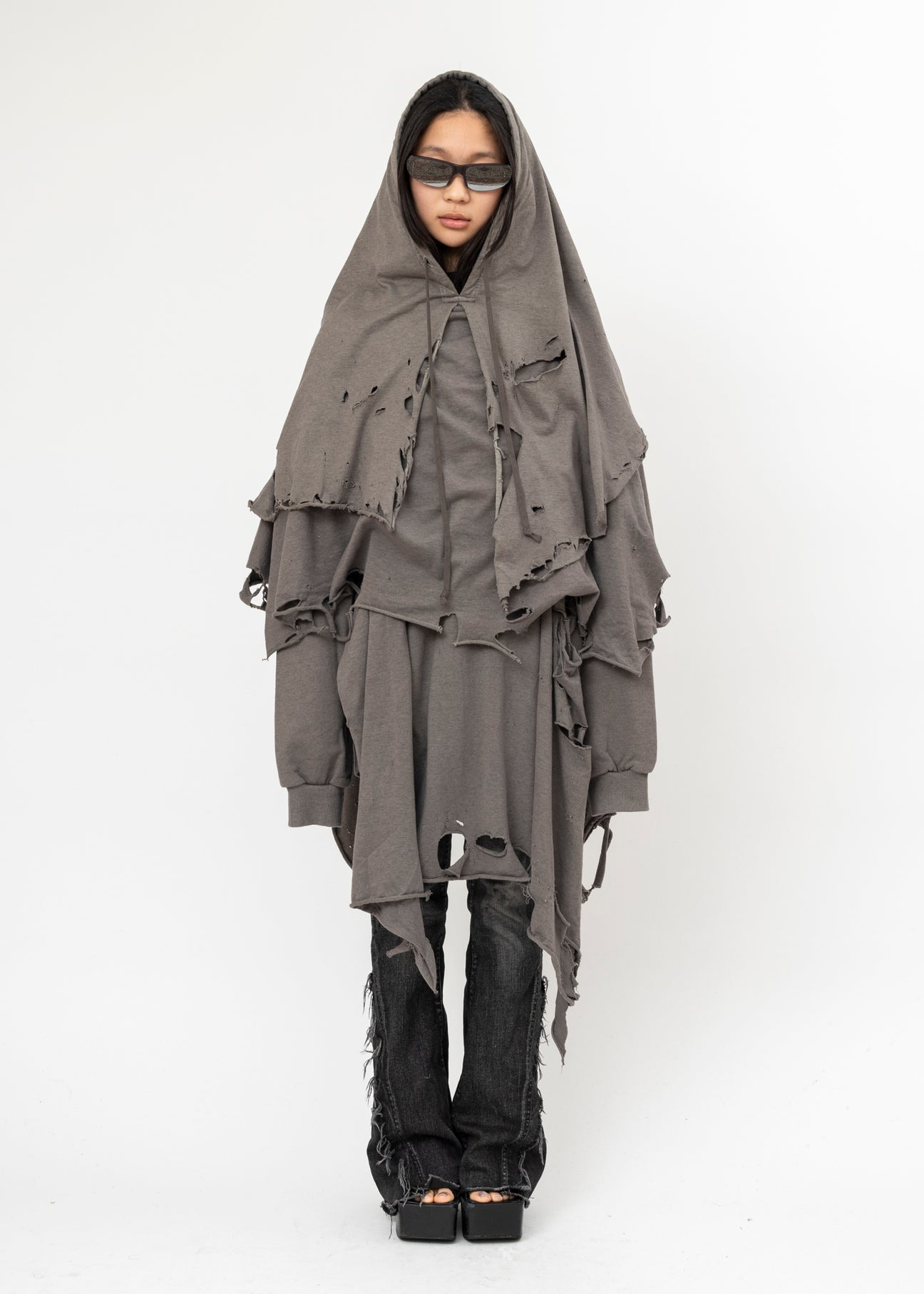 Hooded Cape detail Distressed details Oversized Fit 100% Cotton Made in Japan Model is wearing a size M Model is 5'6" (168 cm), 98 pounds (44kg), usually wears S in tops. A size 25 in denim and S in trousers. Size 7 in shoe size *FINAL SALE*