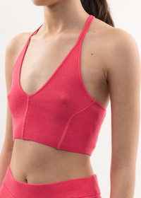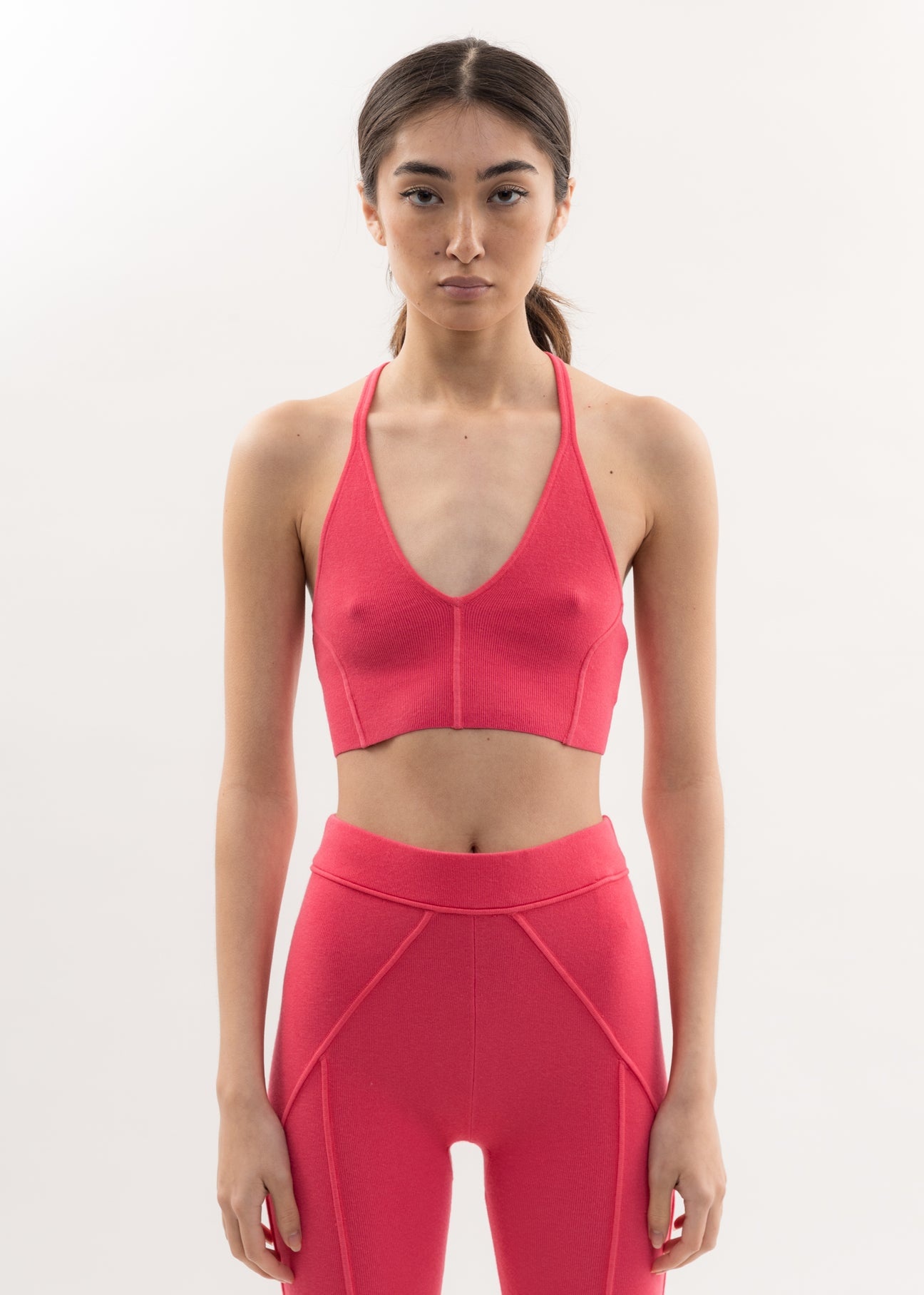 Slim fit viscose-blend rib-knit micro top. Features an elasticized slim-fit construction with exposed seam detailing throughout. Halter neck collar. Finished with tonal stitching throughout. Slim Fit 45% Viscose, 27% Nylon, 23% Polyester, 5% Elastane Imported Model is wearing size XS Model is 5'10 (178 cm), 100 pounds (45 kg), usually wears S in tops. A size 24 in denim and XS in trousers. Size 8 in shoes.