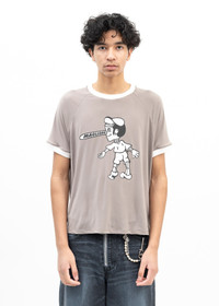 This light grey t-shirt from MAGLIANO features a playful cartoon character graphic across the chest, with “MAGLIANO” extending from the character’s nose in a tongue-in-cheek visual pun. Finished with contrasting white trim at the collar and cuffs for a retro-inspired touch. The smooth, drapey fabric adds a slight sheen and relaxed feel. Slim Fit 95% Polyester, 5% Elastane Made in Italy Model is wearing a size L Model is 6’ (183 cm), 125 pounds (56 kg), usually wears M in tops. A size 30 in denim and 46 in trousers. Size 10 in shoes FINAL SALE