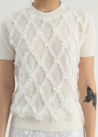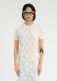 Crewneck knit T-shirt in white, from Shushu Tong. Crafted from rib knit cotton, the White Sequinned T-Shirt features a crewneck design with lace trim and sequinned detailing at the front. Slim Fit 100% Cotton Imported Model is wearing a size 6 Model is 5'7" (172 cm), 98 pounds (44kg), usually wears S in tops. A size 25in denim and S in trousers. Size 8 in shoes. *FINAL SALE*