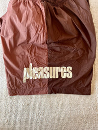 Brand: Pleasures Style: Two-Tone Nylon Shorts Color: Brick/Burgundy Size: Medium (30-32) Year: 2021 Condition: 9/10 (minor discoloring on logo) • Lightweight nylon fabric • Mesh fabric interior • Drawstring waistband • Side pockets & back pocket • Pleasures white logo on left thigh • Great for swim/workout/summer casual ✈️ Ships From Los Angeles ✈️ 📦 Quick Shipping 📦 ✅ Purchased Directly From Pleasures ✅