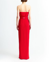 Aeta Gown is a strapless floor-length design in red, structured with an internal corset for a close, sculpted fit. Subtle ruching and front darts shape the form, while a centre-front split at the hem adds movement. A detachable belt cinches the waist for definition. MORE DETAILS Designed for a slim fit. The model is 5'11" (180cm) and wears a UK 8 - Main: 100% Polyester - Lining: 100% Recycled Polyester - Care: Dry cleaning only, iron a low temperature - Made in Great Britain Style number: G-103-AW25-02