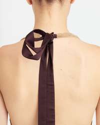 The Auden gown is cut from sheer nude sequin, fitted throughout in a sleek silhouette. The square neckline is framed by halter straps that tie at the back with dark chocolate satin ribbons. The floor-length skirt follows a sheath line and extends into a puddle train for a refined, elongating effect. MORE DETAILS Designed for a slim fit. The model is 5'11" (180cm) and wears a UK 8. - Composition: Main:100% Polyester, Lining: 85% Nylon 15% Spandex - Care: Professional Dry Clean Only - Made in GREAT BRITAIN. Style number: G-124-SS26-02