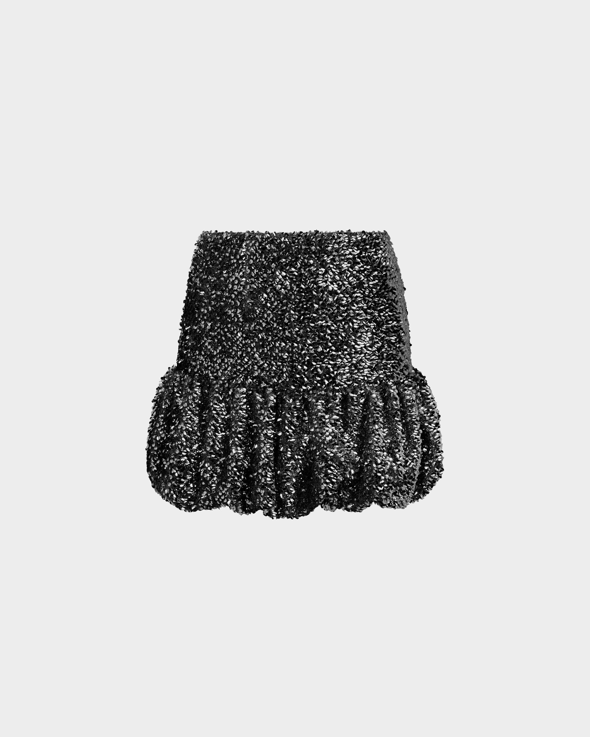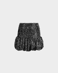 The Branka Mini Skirt is constructed from black textured sequins, delivering subtle shimmer and dimensional surface detail. Cut to a micro length, it sits at the waist with a soft, sculptural bubble hem that creates volume while maintaining a precise, slim silhouette. MORE DETAILS Designed for a slim fit. The model is 5'11" (180cm) and wears a S. - Main: 100% Polyester - Lining: 100% Recycled Polyester - Care: Professional dry clean only - Made in Portugal. Style number: S-MN-162-AW25-01