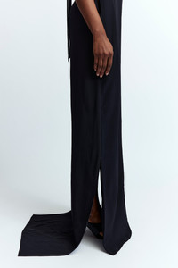 The Clelia Gown is a floor-length dress with a column silhouette, featuring a boat neckline and short bell sleeves. Designed for a close fit, it is cut from signature soft crepe for a sleek, fluid drape. The open back is secured with a tie at the nape, finished with a double-stitched border. Falling to the floor at the front, it extends into a trailing hem at the back for an elegant finish. The design is completed with concealed side pockets at the hips. MORE DETAILS Designed for a regular fit. The model is 5'9.5" (176cm) and wears a UK 8. - Outer: Polyester 100% - Lining: Polyester 100% - Care: Cool wash or dry clean - Made in Portugal Style number: G-078-SS25-01