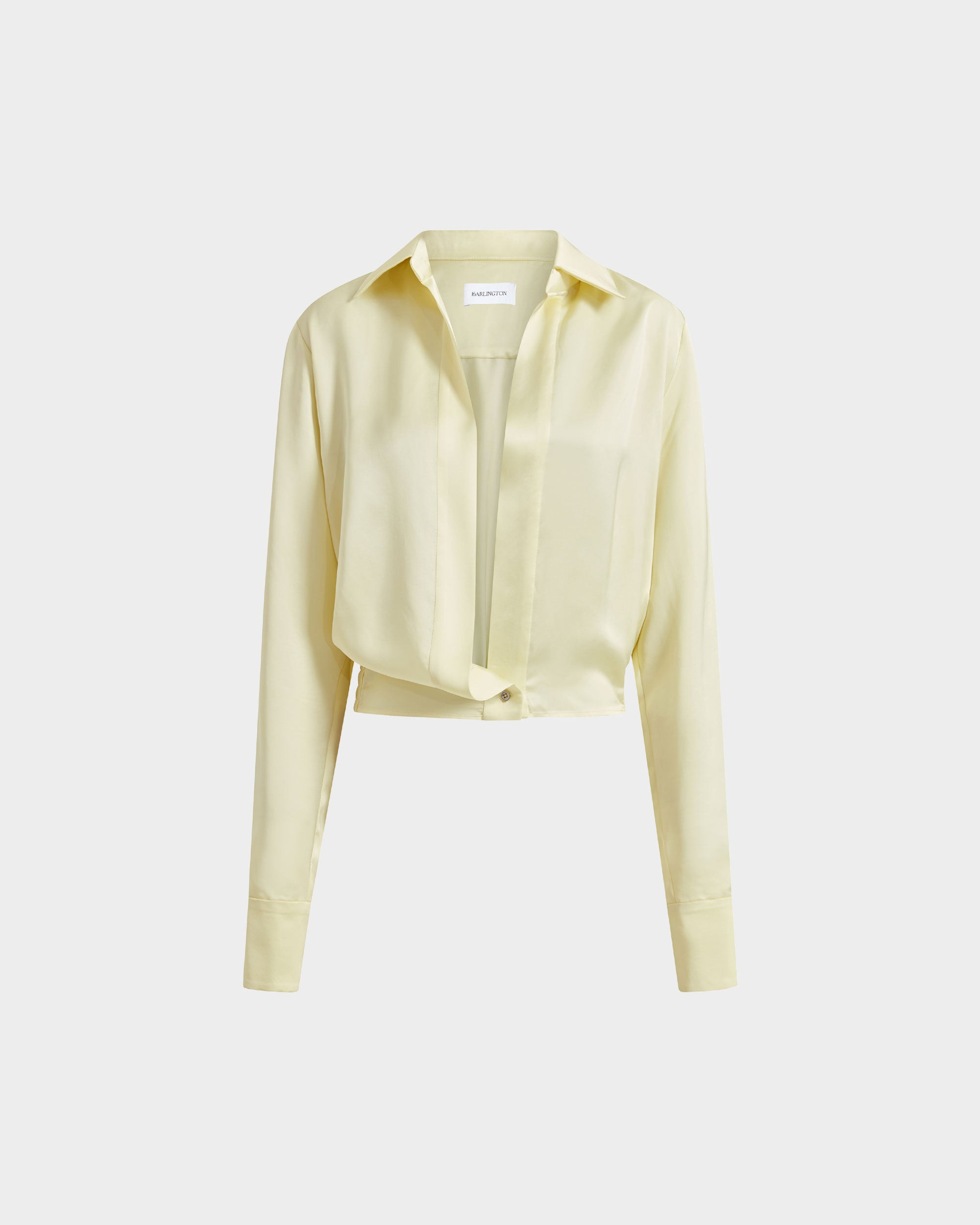 The Cosette Shirt is a deep-plunge collared design with full buttoning along the front. It features a folded detail at the waist, mimicking the look of a tucked-in shirt. With long sleeves and a loose, draped fit, it is cut from lustrous satin in buttery pale yellow and is also available in blue. A core piece of the Spring Summer '25 collection, it was featured on the runway and in the campaign. MORE DETAILS Designed for a relaxed fit. The model is 5'11" (180cm) and wears a UK 8. - Outer: Polyester 100% - Lining: Recycled Polyester 100% - Care: Hand wash or dry clean - Made in Portugal Style number: T-382-SS25-02