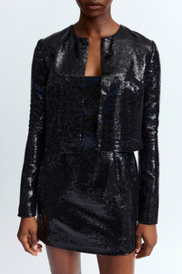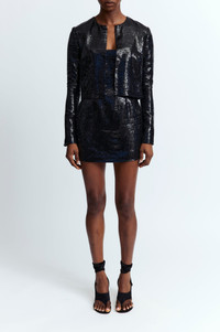 The Keid Cardigan in black is cut from lightweight linen with sequin embellishments throughout. It features a boxy, cropped fit with clean, minimal lines. Pair it with the matching Sior Dress or Minerva Mini Skirt for a coordinated look. MORE DETAILS Designed for a slim fit. The model is 5'9.5" (176cm) and wears a UK 8. - Composition: 100% Polyester - Care: Specialist Dry Cleaning Only - Made in Portugal Style number: T-352-AW25-HS-C