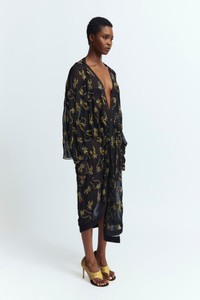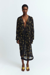 The Licia Dress in black features a deep plunge neckline, long sleeves, and cuffed wrists. Citrine-colored hotfix crystal embellishments in a custom floral pattern accent the design. Ruching along the waist adds subtle shape, while the loose fit and below-the-knee length create an effortlessly relaxed silhouette. A key design from the SS25 runway, this style defines the season’s statement look. MORE DETAILS Designed for a relaxed fit. The model is 5'9.5" (176cm) and wears a S. - Outer: Polyester 100% - Lining: Recycled Polyester 100% - Care: Specialist Dry Cleaning Only - Made in Portugal Style number: D-MD-590-SS25-01