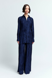 The Mandrake Trouser in navy is a wide leg plisse trouser that has an accompanying shirt. The trousers are voluminous and carry a lot of movement. They also have two pockets either side of the waist. They are designed to fit loosely to the body and they fall to the floor. For a full look, they can be worn with the Marley Shirt in Plisse MORE DETAILS Designed for a relaxed fit. The model is 5'10.5" (178cm) and wears a UK 8. - Outer: 100% Polyester - Care: Hand wash only - Made in Portugal Style number: TR-102-SS25-1