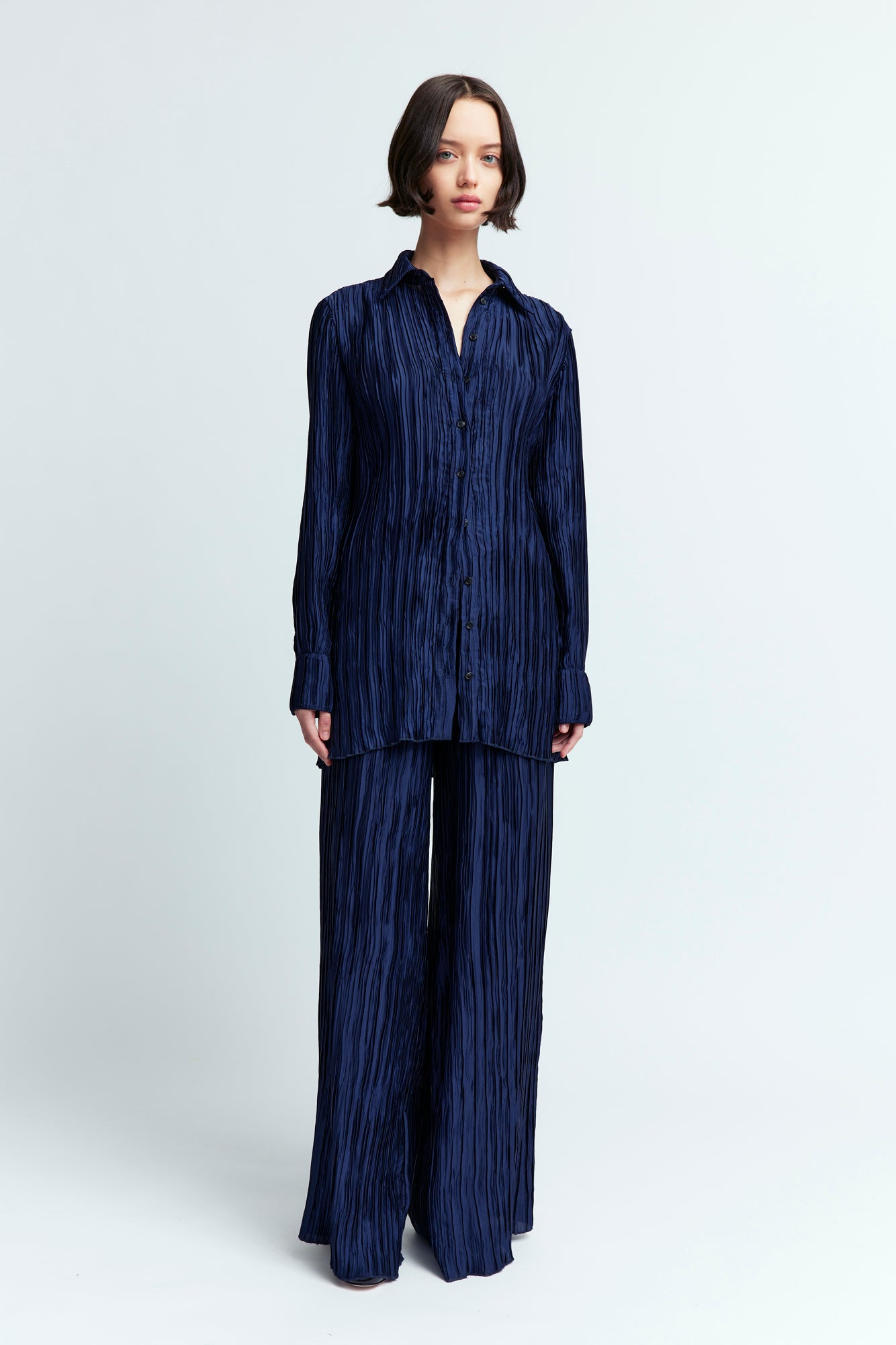 The Marley Shirt in navy is a plisse button up shirt with volume. It flows with every movement and can be worn with the matching trousers for a complete look. It is also available in a khaki green colourway MORE DETAILS Designed for a relaxed fit. The model is 5'10.5" (178cm) and wears a UK 8. - Outer: 100% Polyester - Care: Hand wash only - Made in Portugal Style number: T-307-SS25-1