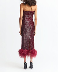 The Minelli Midi Dress is a strapless, fitted design crafted from rich burgundy textured sequin. Structured with an internal corset for a sculpted silhouette, it features a feathered hem that brings dynamic movement and a tactile contrast to the shimmering finish. MORE DETAILS Designed for a slim fit. The model is 5'10" (178cm) and wears a UK 8. - Main: 100% Polyester - Lining: 100% Recycled Polyester - Trim: 100% Ostrich Feather - Care: Professional dry clean only - Made in Portugal. Style number: D-MD-648-AW25-02