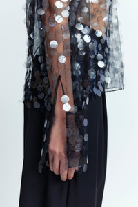 The Olall Top in black sequin is a funnel neck long sleeve. It is a sheer top covered in grey paillette embellishments to add an exciting 16Arlington element. It can be fastened at the back with a zip that reaches all the way to the neck. The Olall Top is also available in textured tassel and crepe. MORE DETAILS Designed for a relaxed fit. The model is 5'10.5" (178cm) and wears a UK 8. - Outer: 100% Polyester - Care: Hand wash only - Made in Portugal Style number: T-320-SS25-5