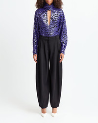 Olamo Top features purple sequins layered over a black lace base, creating depth and texture. It has a high neckline with a front keyhole cut-out and long sleeves for balance and structure. MORE DETAILS Designed for a regular fit. The model is 5'10" (178cm) and wears a UK 8 - Main: 100% Polyester - Lining: 100% Polyester - Care: Dry cleaning only, iron a low temperature - Made in Great Britain Style number: T-415-AW25-03