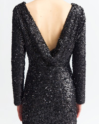 The Reta Gown is a striking floor length piece crafted from textured black sequin that shimmers subtly with movement. It features long sleeves and a cowl V-neck back, paired with a sleek split that adds ease and drama to its fitted silhouette. MORE DETAILS Designed for a regular fit. The model is 5'11" (180cm) and wears a UK 8. - Main: 100% Polyester - Lining: 100% Recycled Polyester - Care: Professional dry clean only - Made in Portugal. Style number: G-099-AW25-01